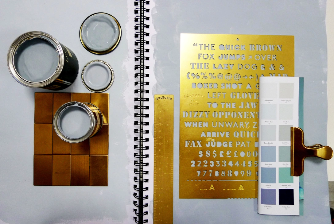 Краска Bone Chine Blue 107, Little Greene и Parma Gray 27, Farrow & Ball, шоу-румы Manders. Линейка The Golden Rule и трафарет The Copycat, коллекция Eclectic, Tom Dixon, салоны ≪Интерьер Market≫, Galerie 46. Палитра красок Sanderson, шоу-румы Manders