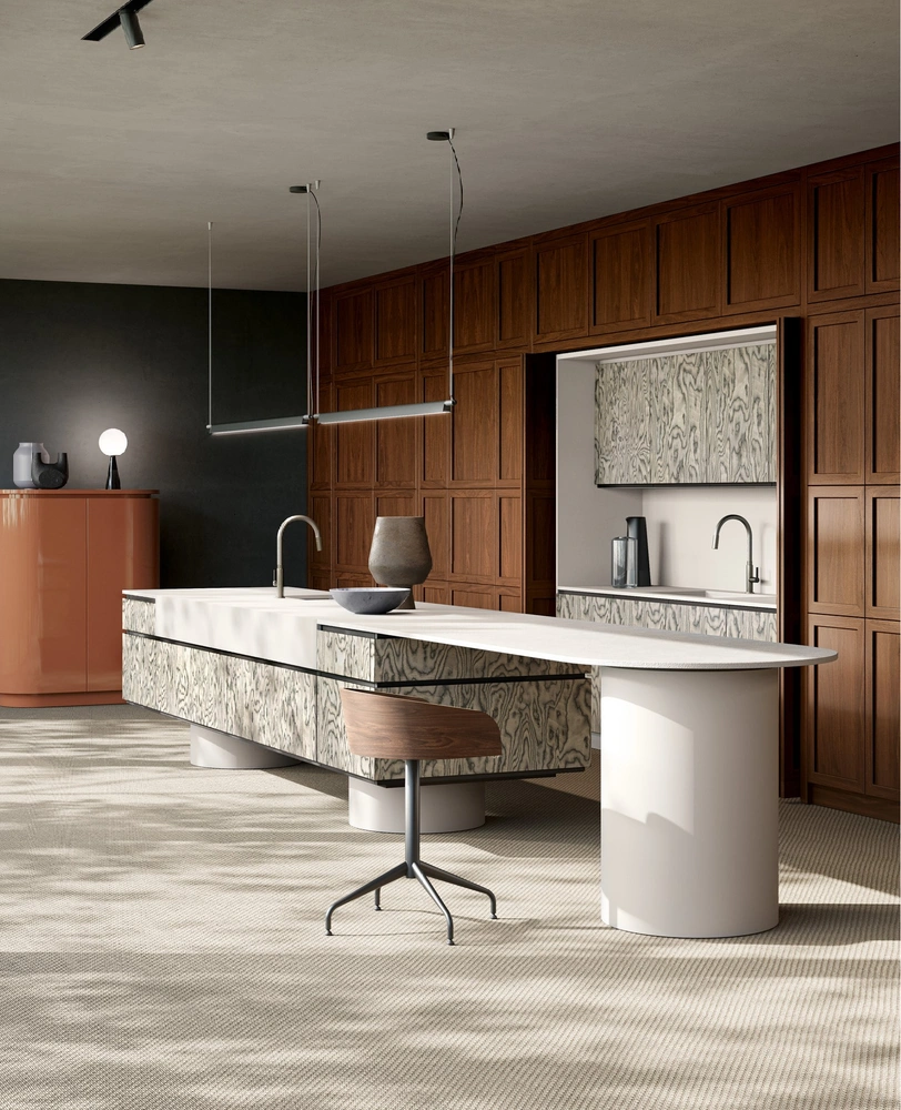 Новую кухню Pinea от Toncelli украшает скульптурная напольная раковина в виде колонны, www.toncelli.it