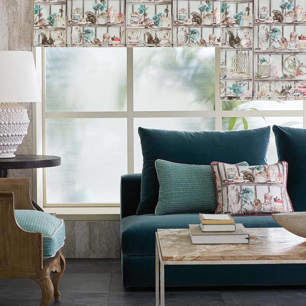 Создать теплую атмосферу в гостиной помогут английские ткани. Большой выбор – у марки Osborne & Little. Наш фаворит – эта ткань с изображением сов и белочек. Рисунок можно рассматривать бесконечно! Дизайнеры предлагают обтянуть этой же тканью одну из диванных подушек. @osborneandlittle Squirrels in the sitting room! Curio blinds co-ordinated with Mikado Velvet on the sofa in dark aqua.