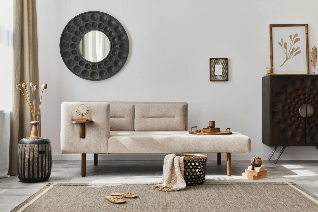 Прямоугольные диваны и квадратные кресла, похоже, уходят из наших интерьеров. Строгие, прямолинейные формы мебели уступают место более мягким и округлым силуэтам. В моду входят плавные линии, которые создают уют и привносят органичность в пространство. Строгая минималистская мебель делает интерьер слишком «холодным» на фоне новых веяний и общему стремлению к уюту. Если мебель уже закуплена, сгладьте углы с помощью небольшого круглого зеркала или изогнутой напольной лампы.