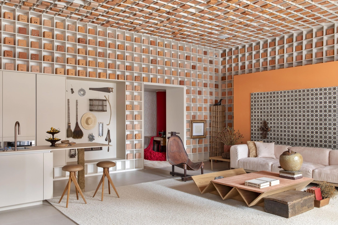 По словам Габриэля, простая планировка преследует вполне конкретную цель: подчеркнуть повторяющуюся геометрию с помощью стеллажей, которые занимают практически все стены и перетекают на потолок в виде такого же рисунка в виде одинаковых квадратных ячеек. Эти конструкции выполнила на заказ компания Simonetto.Oficial, в них 2500 ниш размером 25х25 см, заполненных кирпичами, изготовленными руками мастеров из коммуны Мария-ду-Барру в Бразилии.