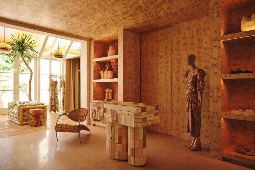 Флагманский магазин Ulla Johnson в Западном Голливуде — настоящее визуальное приключение для обычных посетителей и для профессиональных дизайнеров. Чтобы отразить бунтарский дух южной Калифорнии, дизайнер Келли Уэстлер (Kelly Wearstler) соединила в интерьере оттенки песка и узорчатую древесину капа с винтажной мебелью итальянского модерниста Карло Скарпы (Carlo Scarpa). Необычный шпон использовался для покрытия стен, потолков и полок по всему шоуруму.