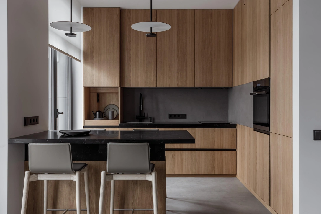 Почти вся мебель изготавливалась на заказ, архитектор стремился делать каждый элемент максимально функциональным и лаконичным, чтобы не перегрузить пространство. Кухня компактна, но продумана до мелочей. Лаконичные фасады с теплой текстурой дерева уравновешивают грубый микроцемент на фартуке. Основание дивана плавно переходит в лестницу, которая как будто перетекает в консольный рабочий стол на втором этаже, дополненный оранжевым полубарным стулом.