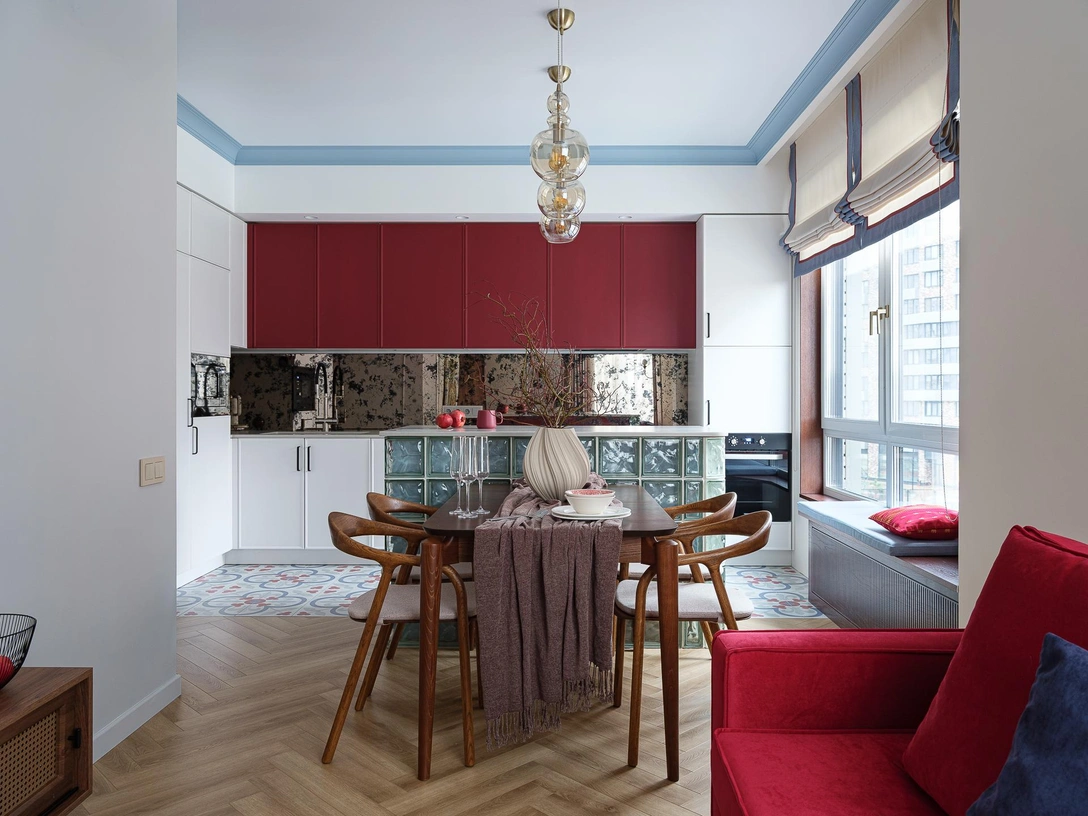 В кухне-гостиной есть много интересного: остров с основанием из стеклоблоков, в которые встроена подсветка, и кухонный фартук из состаренного зеркала — моя любимая деталь! Эффектно смотрятся и фасады в цвете бургунди, который повторяется в гостиной, в мягкой мебели и аксессуарах — так у меня получилось объединить две зоны, зарифмовать их.