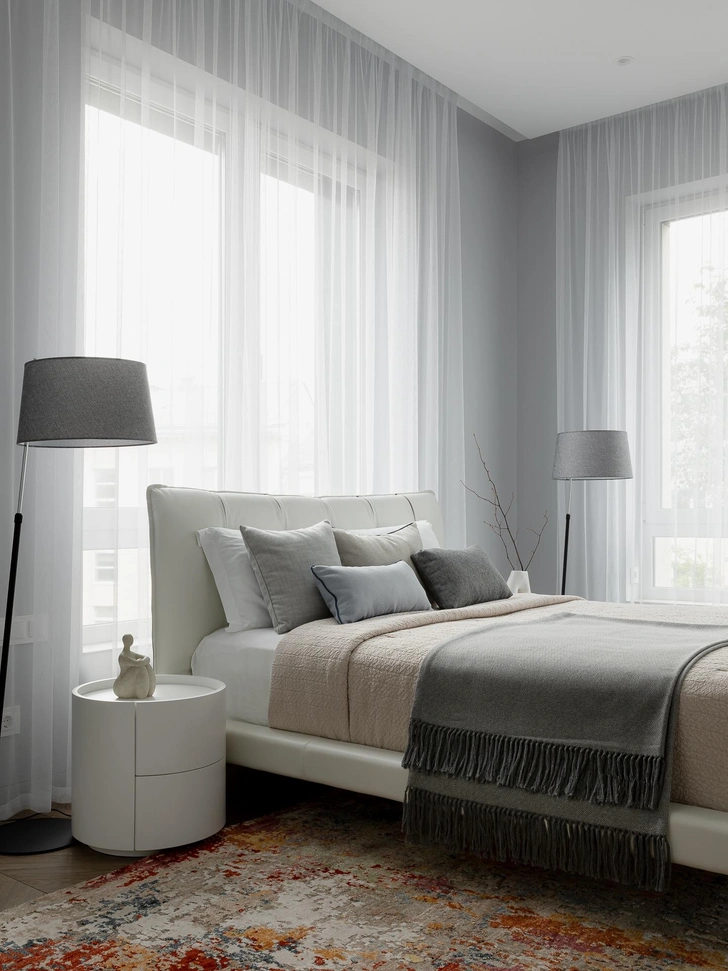 «В спальне ключевую роль играет ковер — без него пространство потеряло бы индивидуальность — его терракотово-бордовые оттенки отражают цветовую гамму гостиной и кухни. Такие детали помогают объединить все зоны, сделать интерьер целостным».