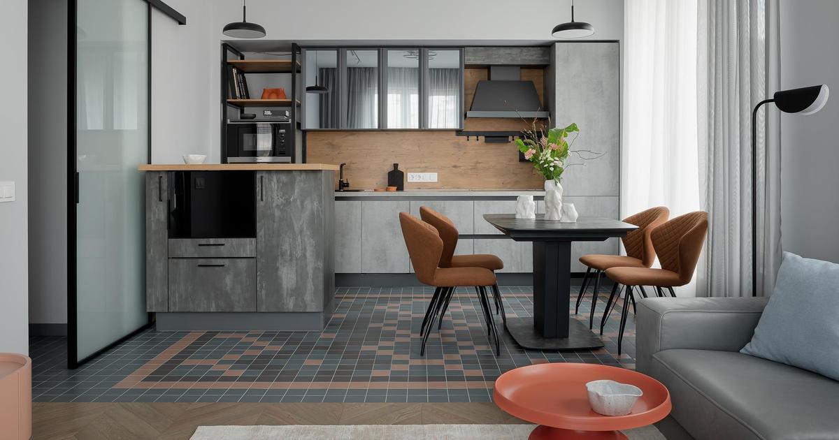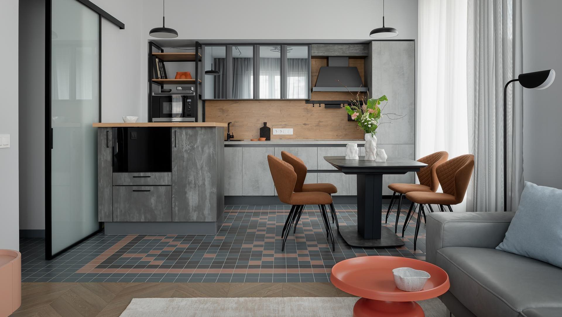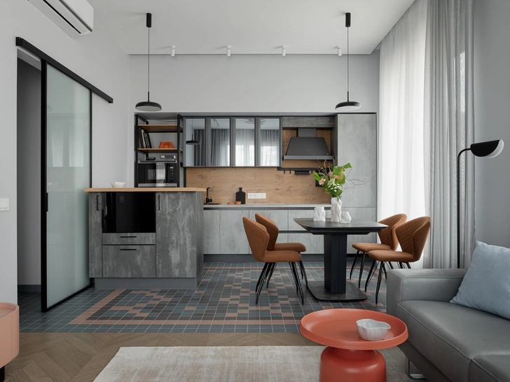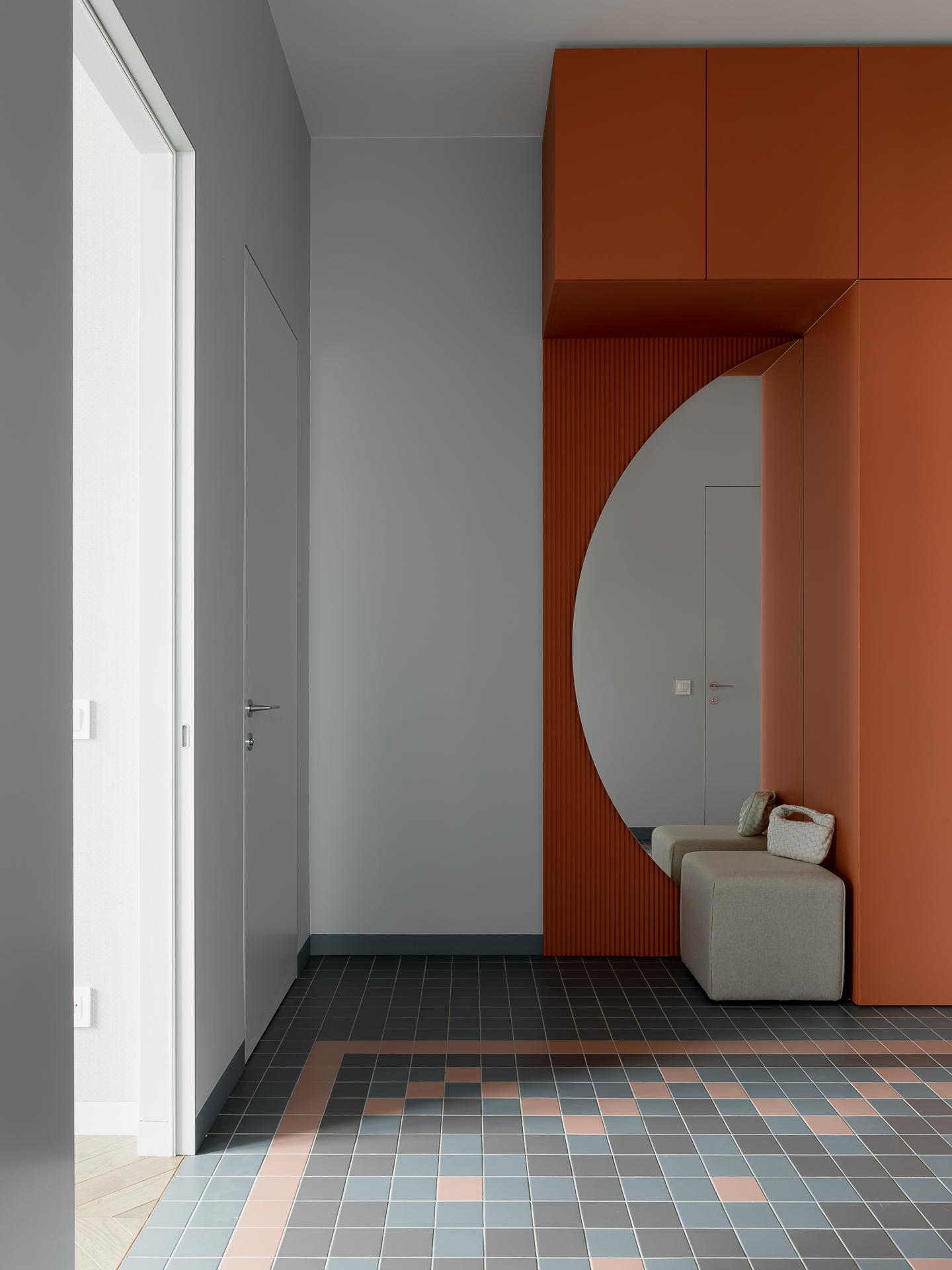 «Изначально здесь не было перегородок — чистое поле для будущей архитектуры. Мы начали с прихожей, здесь можно увидеть самый необычный, на мой взгляд, элемент — яркий шкаф. Пол украшает ковер из плитки, этот же рисунок, кстати, можно увидеть и в кухне-гостиной».