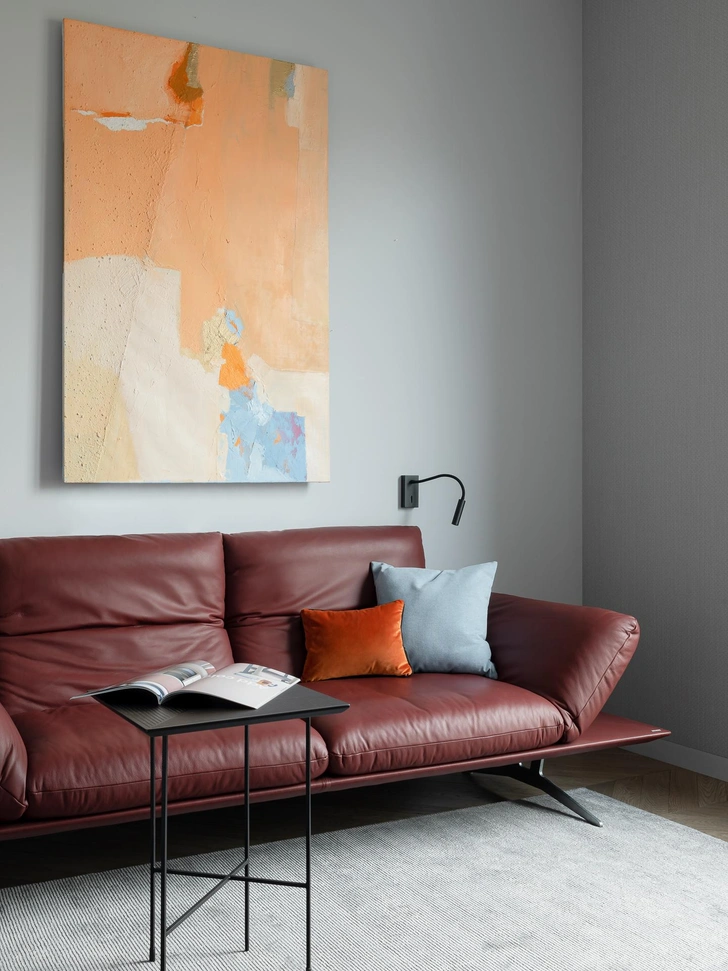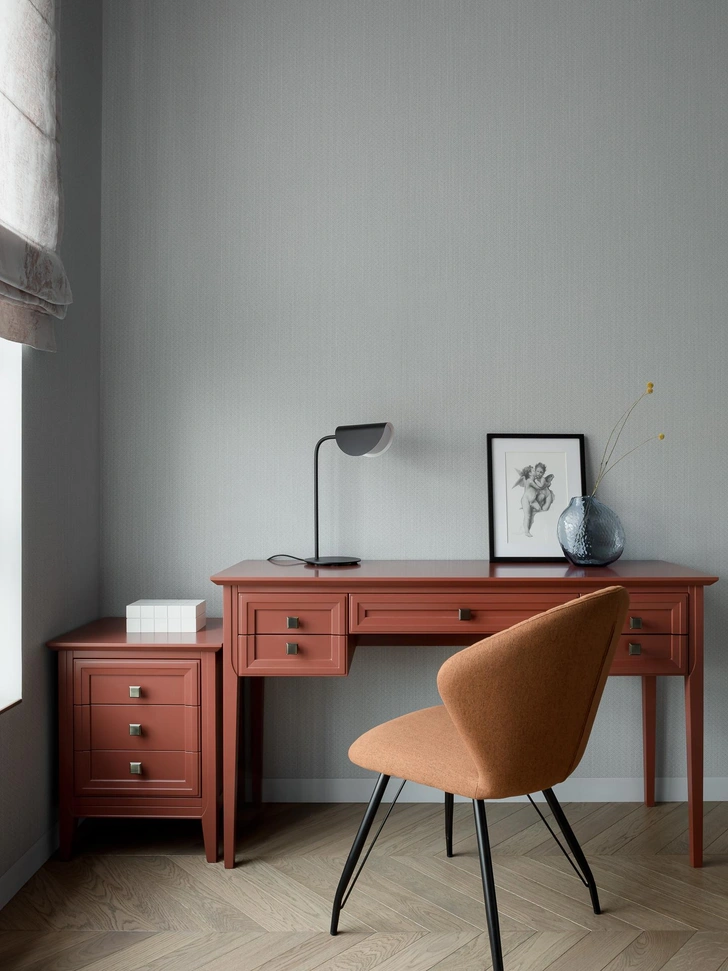 «Отдельное внимание мы уделили персональному кабинету — тихому, собранному пространству, в котором заказчица планирует работать над своей книгой. Его украшает удобный терракотовый стол и темно-вишневый диван».