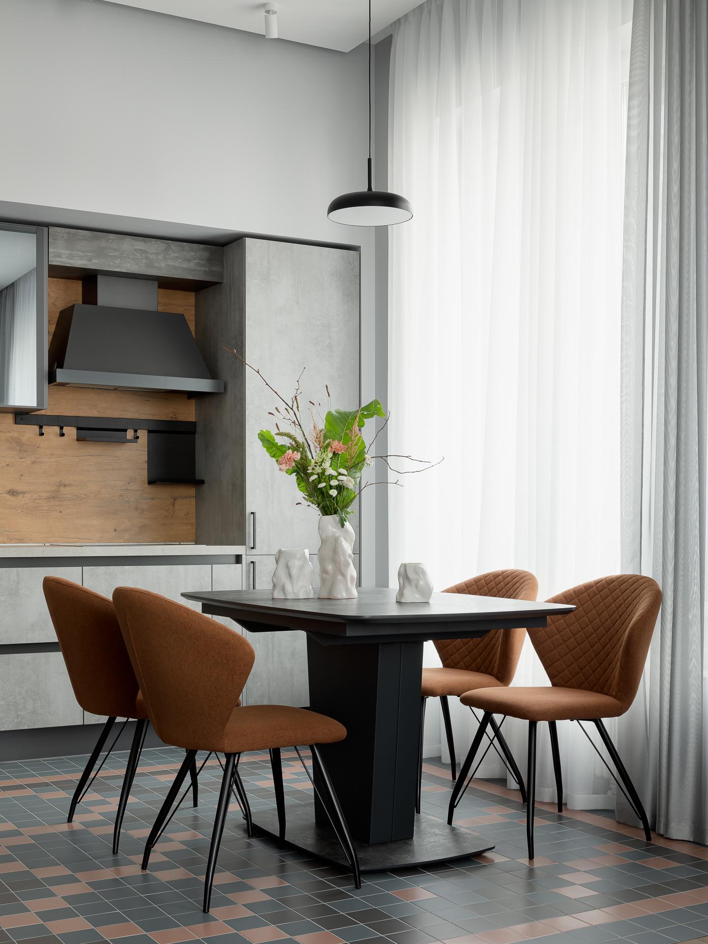 Журнальный столик «Ньюман», «Диван.ру». Торшер, треки и подвесные светильники, Maytoni. Кухонный гарнитур и обеденная группа (стол и стулья), Home Fort. Стеклянная перегородка, Union. Инженерная доска, Vite Albero. Все ковы, «Ковер.ру». Шторы, MRoom.