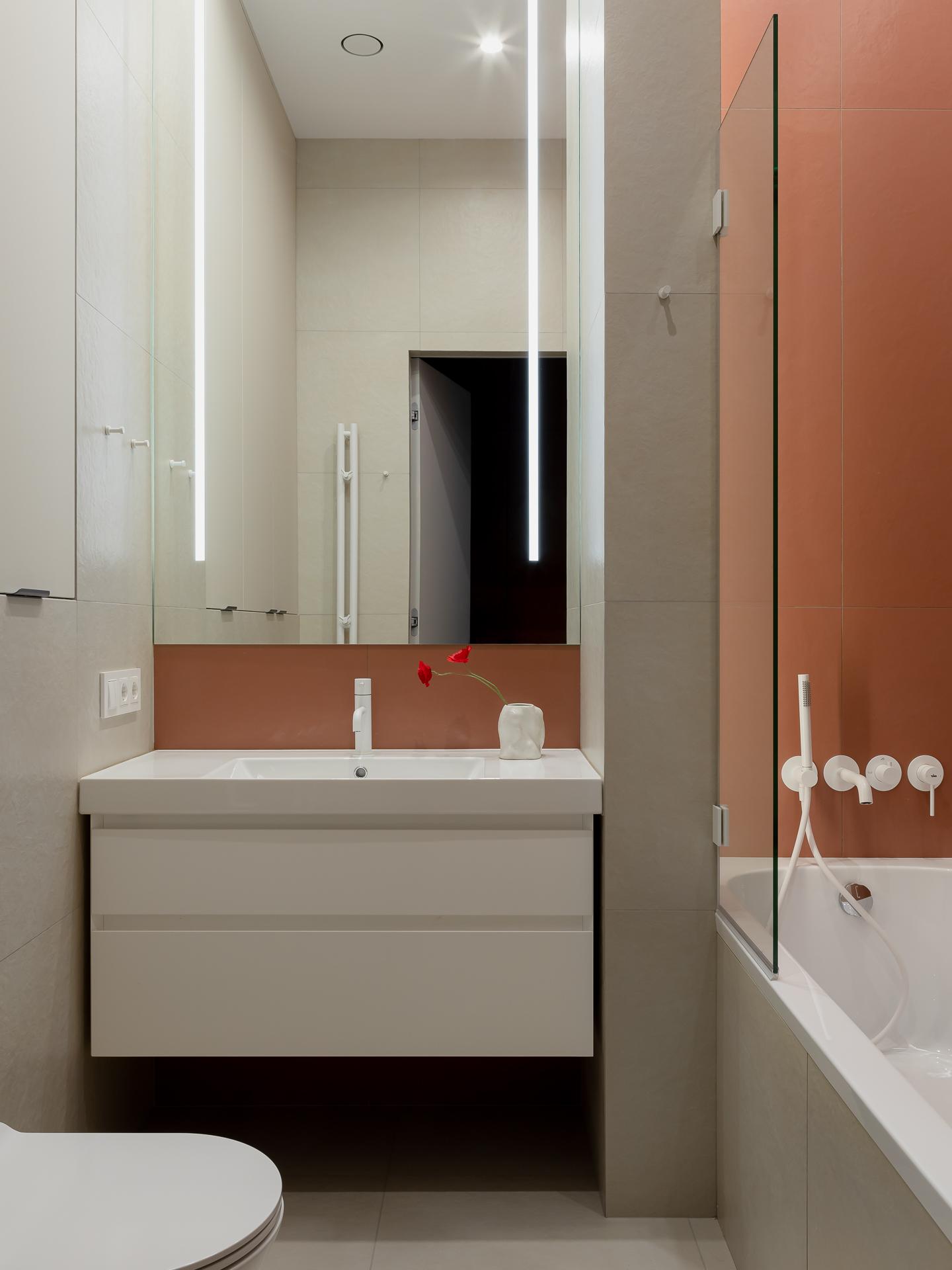 Керамогранит, Kerama Marazzi («Керама Марацци») и Italon. Сантехника Uno, Boheme. Тумба с раковиной, Kerama Marazzi («Керама Марацци»). Шкафы над инсталляцией, «Любимая кухня». Зеркало на заказ, Zazerkalie.pro. Полотенцесушитель «Нюанс», «Сунержа».