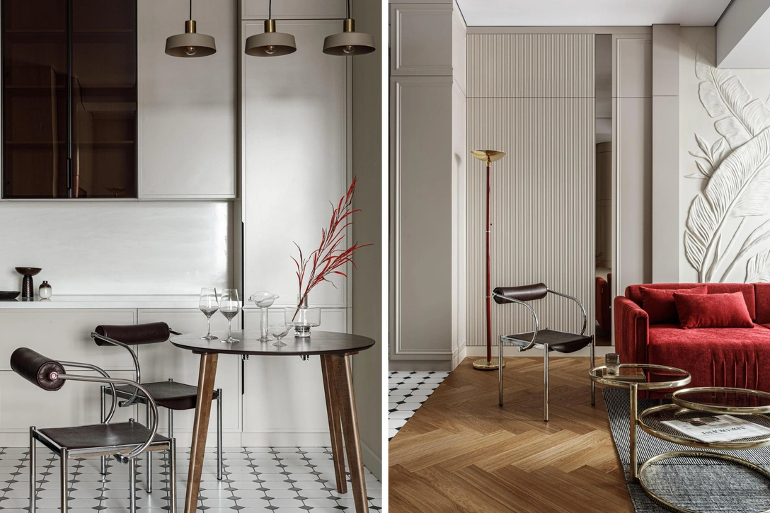 Интерьер сочетает в себе эстетику mid-century, soft modern и элементы ар-деко — современные предметы соседствуют с винтажными. Основой стал выразительный паркет и натуральные материалы. Визуально расширить пространство и впустить в него больше света помогли зеркала, а смягчили композицию ручная лепнина, скругленные формы и индивидуальные плинтусы на заказ.