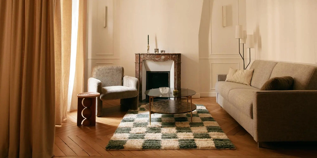В гостиной авторы проекта подчеркнули элементы в османском стиле (мраморный камин, паркет и молдинги). Они перекликаются с более современными деталями, такими как зелено-белый ковер Rugvista и табурет Batiik Studio от Monoprix. Алебастровые бра NV Gallery и люстра Bubba от Normann Copenhagen подчеркивают современный характер интерьера, а шторы делят комнату на части, создавая эффект кокона.