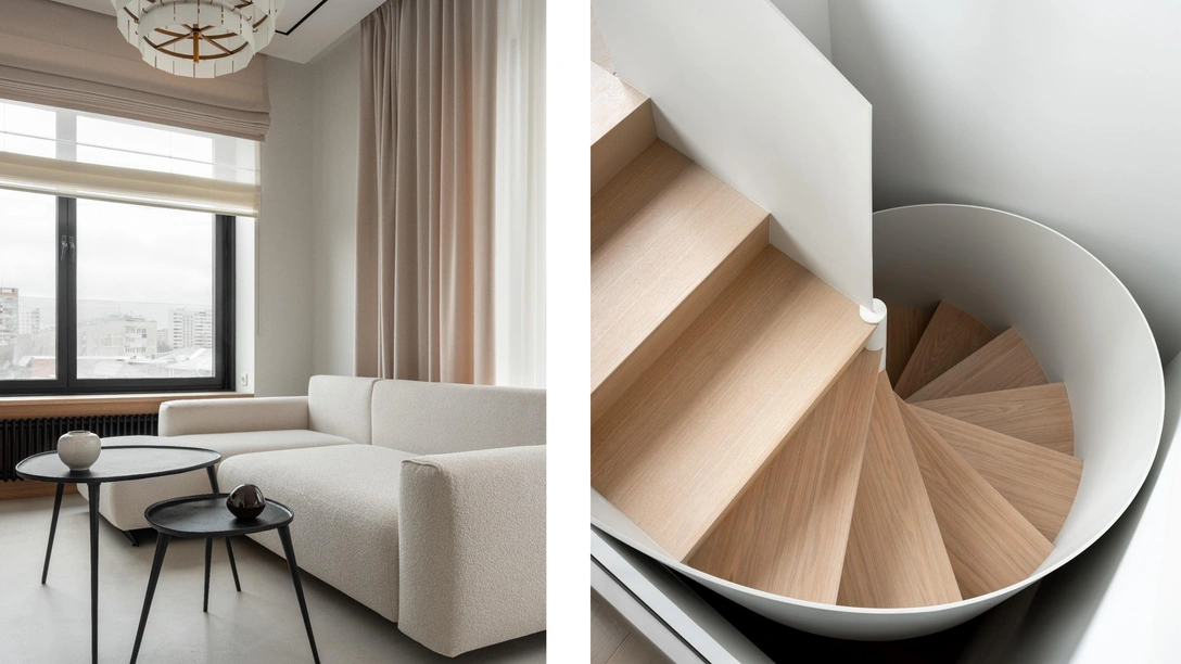 Самый необычный и интересный элемент интерьера — лестница, ведущая на второй этаж в спальню. Ее плавные линии смягчают строгий проем и гармонично вписываются в пространство. Она изготовлена из металлического каркаса, а благодаря своему цвету выглядит воздушной и легкой. Лестница реализована компанией Hard Massive по моим эскизам.