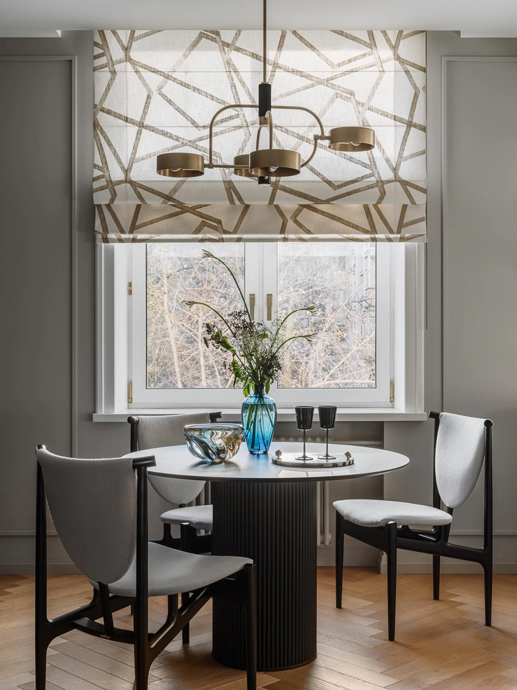 А тарелки Fornasetti — это сумма моей любви и любви заказчиков к Италии и итальянскому предметному дизайну. Можно сказать, эти пять тарелок — своего рода говорящее «многоточие», объединяющее графику, формы пространства кухни-столовой, текстиль окон, контрастные предметы мебели с латунью светильника над обеденным столом.