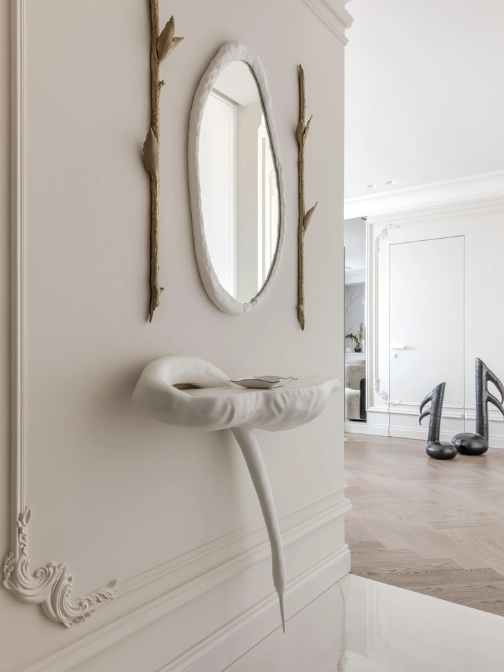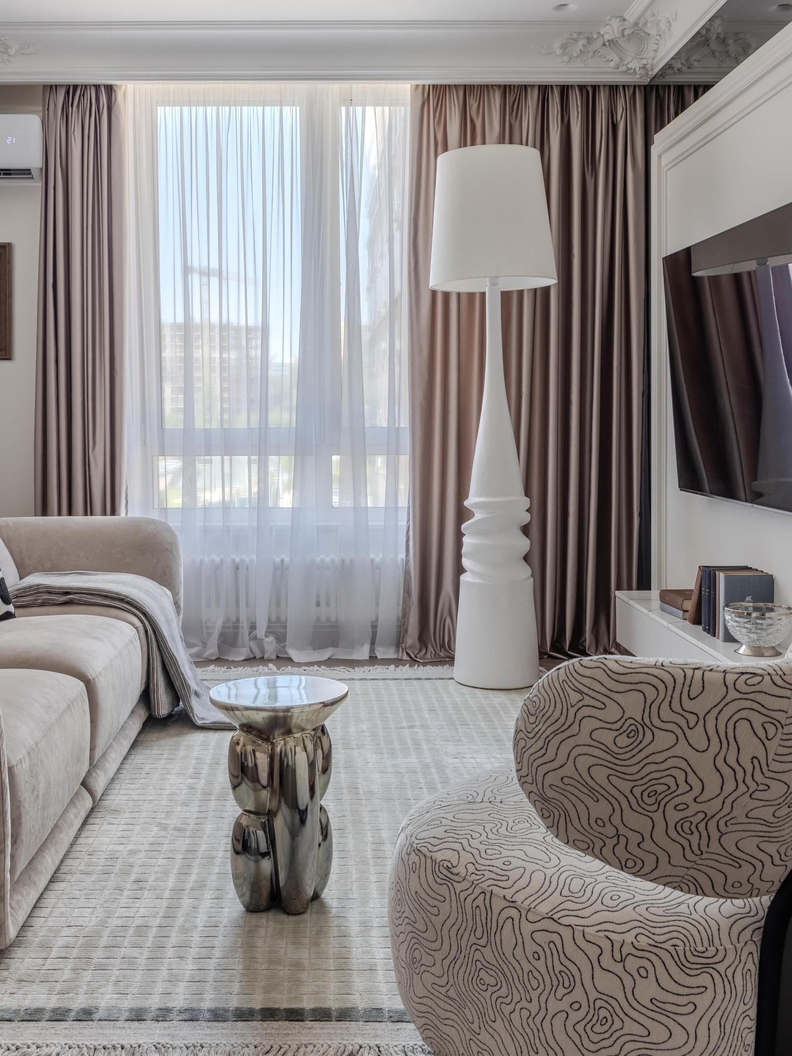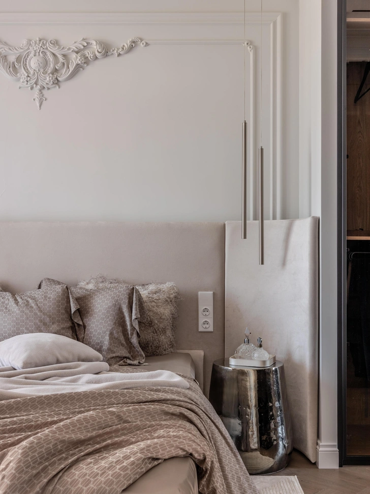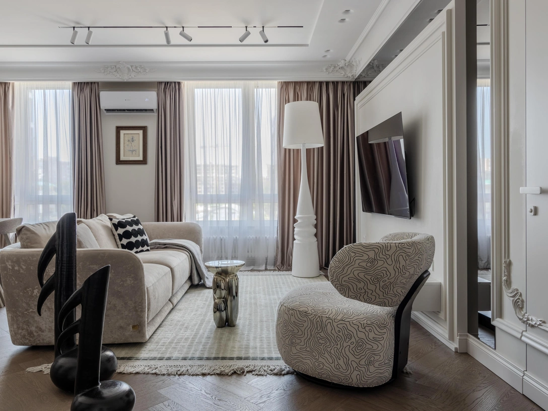 Заказчики хотели видеть интерьер, в котором сочетаются элегантность и практичность, при этом без чрезмерной контрастности и массивных деталей. Они точно не хотели загроможденной обстановки, излишней вычурности. Поэтому мы использовали сочетание современных минималистичных фасадов и классической лепнины, что создает баланс между строгостью и мягкостью. Из архитектурных приемов — встроенные ниши для хранения, световые акценты и декоративные элементы из натуральных материалов. В качестве декора — художественное оформление деталей мебели.