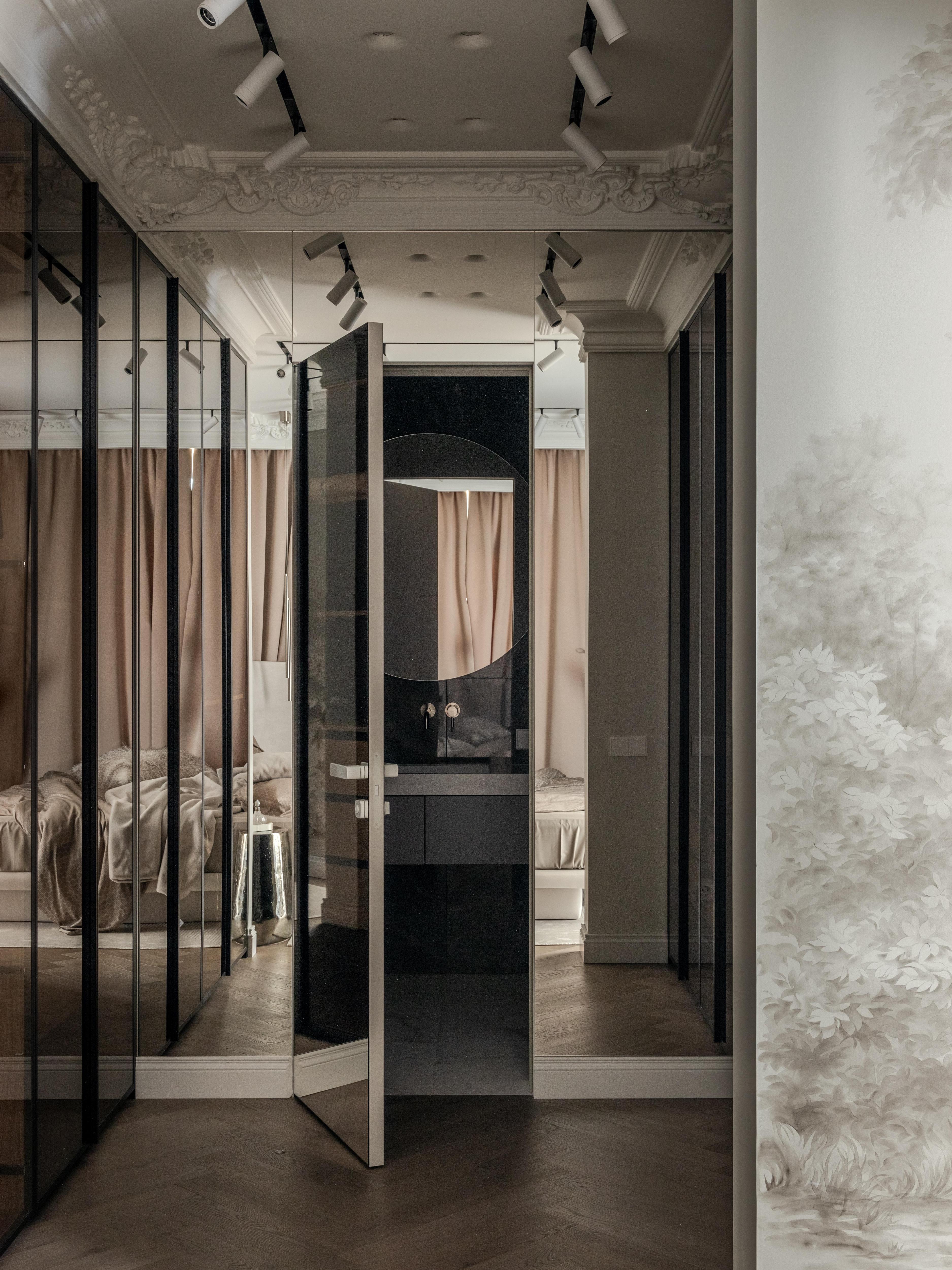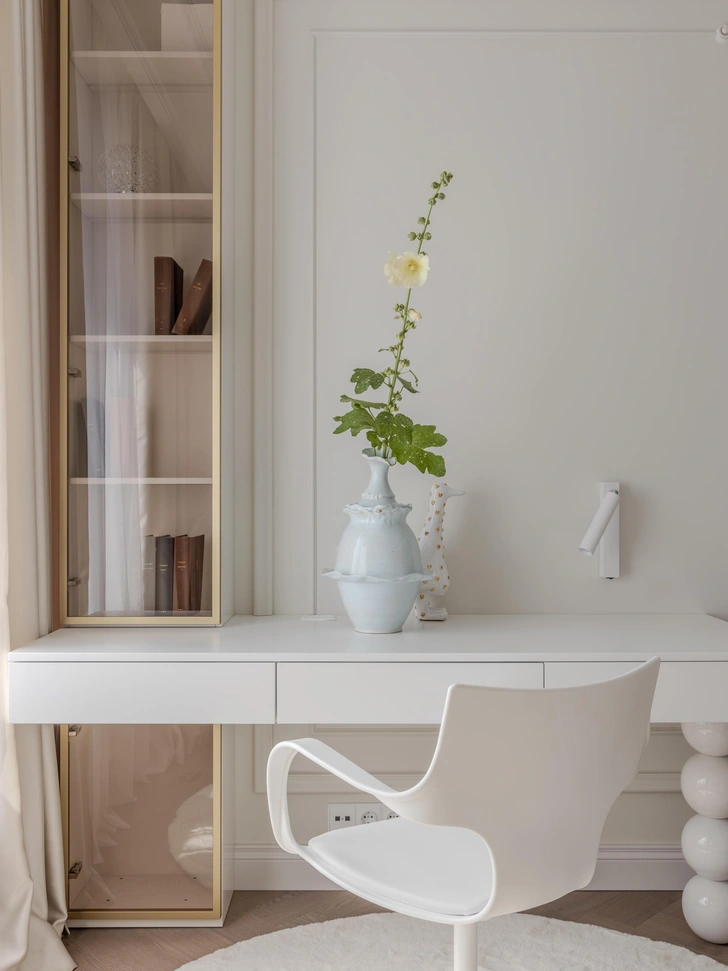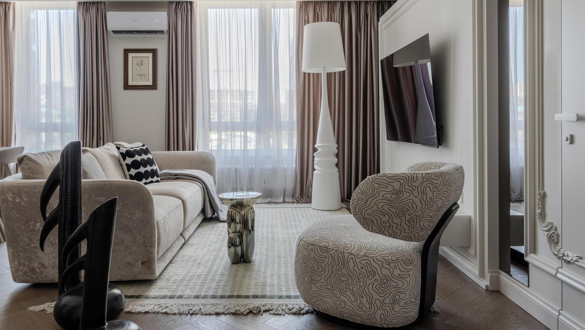 Заказчики хотели видеть интерьер, в котором сочетаются элегантность и практичность, при этом без чрезмерной контрастности и массивных деталей. Они точно не хотели загроможденной обстановки, излишней вычурности. Поэтому мы использовали сочетание современных минималистичных фасадов и классической лепнины, что создает баланс между строгостью и мягкостью. Из архитектурных приемов — встроенные ниши для хранения, световые акценты и декоративные элементы из натуральных материалов. В качестве декора — художественное оформление деталей мебели.