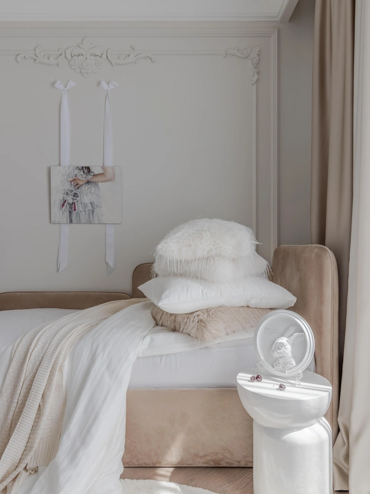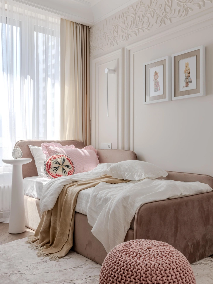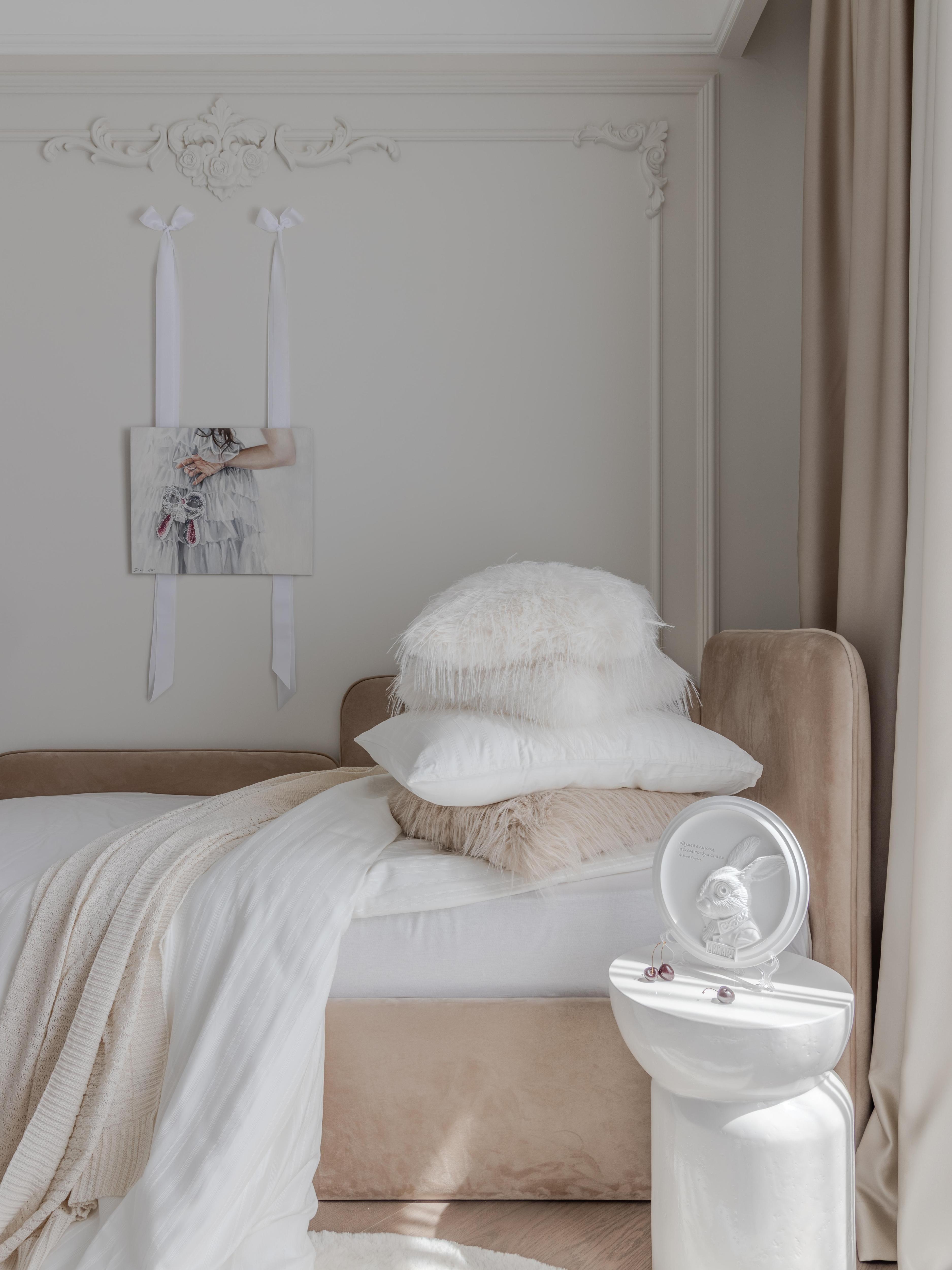Главной для нас здесь стала гармония: мы гордимся, что интерьер получился не только классически комфортным, но и по-современному индивидуальным. Мягкие материалы в сочетании с выверенными формами создают ощущение защищенности, которое так важно для молодой семьи с детьми.