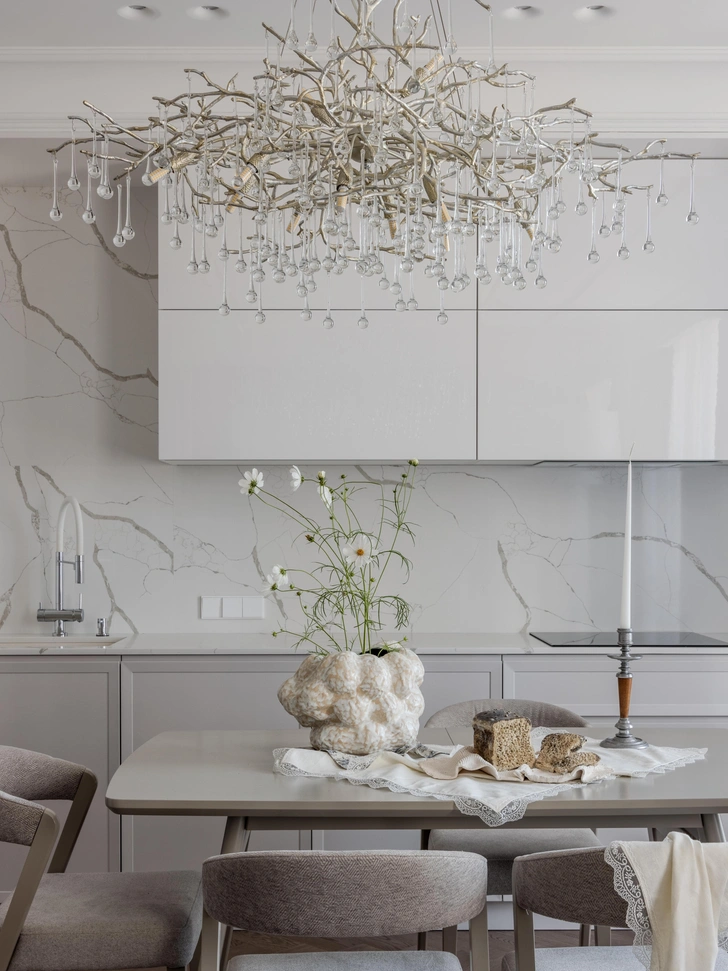 Самым ярким предметом стали уникальные обои ручной росписи в спальне — настоящее произведение искусства, привлекающее внимание. Важную работу сыграли и светильники: они составили уютную атмосферу для семейных вечеров и теплых разговоров. А какой эффектной получилась кухня с «ветвящейся» люстрой!