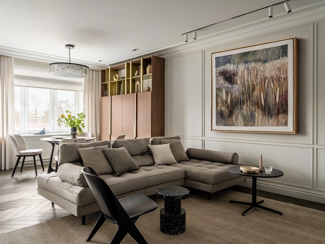 Заказчики склонялись к современному стилю с нотками классики. Дубовый паркет «елочкой» на полу и тонкие изящные молдинги на стенах помогли создать элегантный фон, на которой наносили акценты. «На протяжении всей работы мы с заказчиками планировали паркет карамельного оттенка, мечтали о мягких коврах и диване из мягкой замши, и готовились ко всем нюансам эксплуатации таких деликатных материалов. Но ближе к концу ремонтных работ незапланированно появился очаровательный кудрявый щенок по кличке Бруно. Корректировать что-то было уже поздно, поэтому Бруно наслаждается удобствами наравне со всеми».