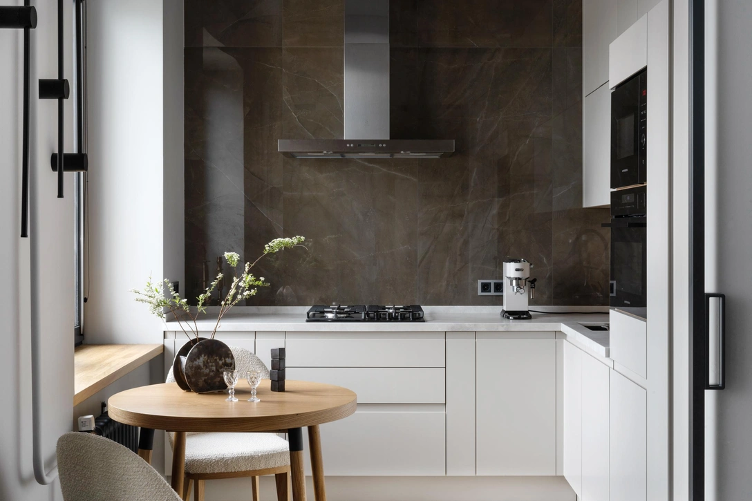 «Квартира находится на последнем этаже сталинского дома, — рассказывает автор проекта. — Из окна кухни виднеются красивые лепные элементы, я специально попросила фотографа захватить кусочек капители со время съемки. Архитектура здания, окружающий район и общее настроение располагало к бережному отношению к истории. При этом заказчикам нравится скандинавский стиль, который мы постарались увязать с легкими отсылками к классике».