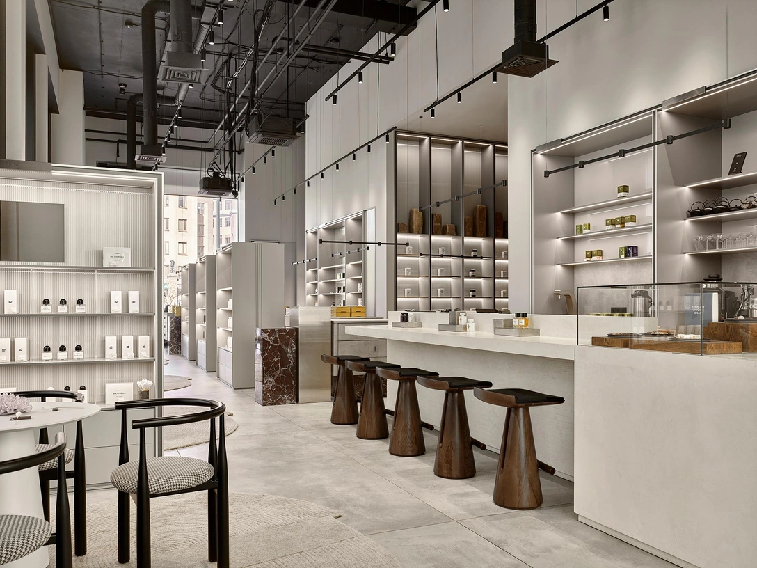 С помощью интерьера мы стремились передать философию компании — тихую роскошь, утонченность, высокий сервис, натуральность и ничего лишнего. Бьюти-квартира состоит из двух зон: зона ритейла с шоколатерией расположена вдоль панорамных окон, а в глубине пространства — салон красоты с зонами маникюра и косметологическими кабинетами. Все это находится в открытом пространстве, смотрится целостно, без ощущения дробления, но при этом обособленно.