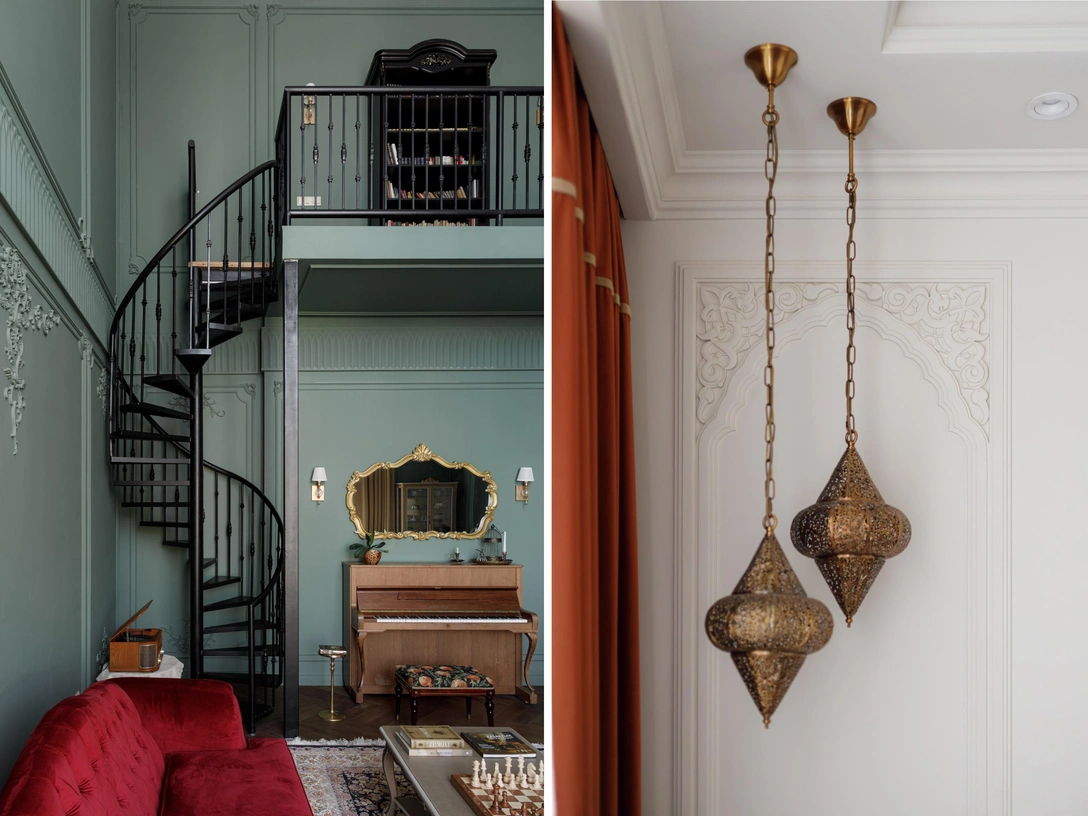 Настоящей семейной реликвией стало и винтажное пианино — оно украшает гостиную. Главная комната очень высокая, целых семь метров, и мы добавили второй уровень, где организовали семейную библиотеку. К ней ведет черная винтовая лестница — выглядит очень эффектно. Она стала одним из главных акцентов.