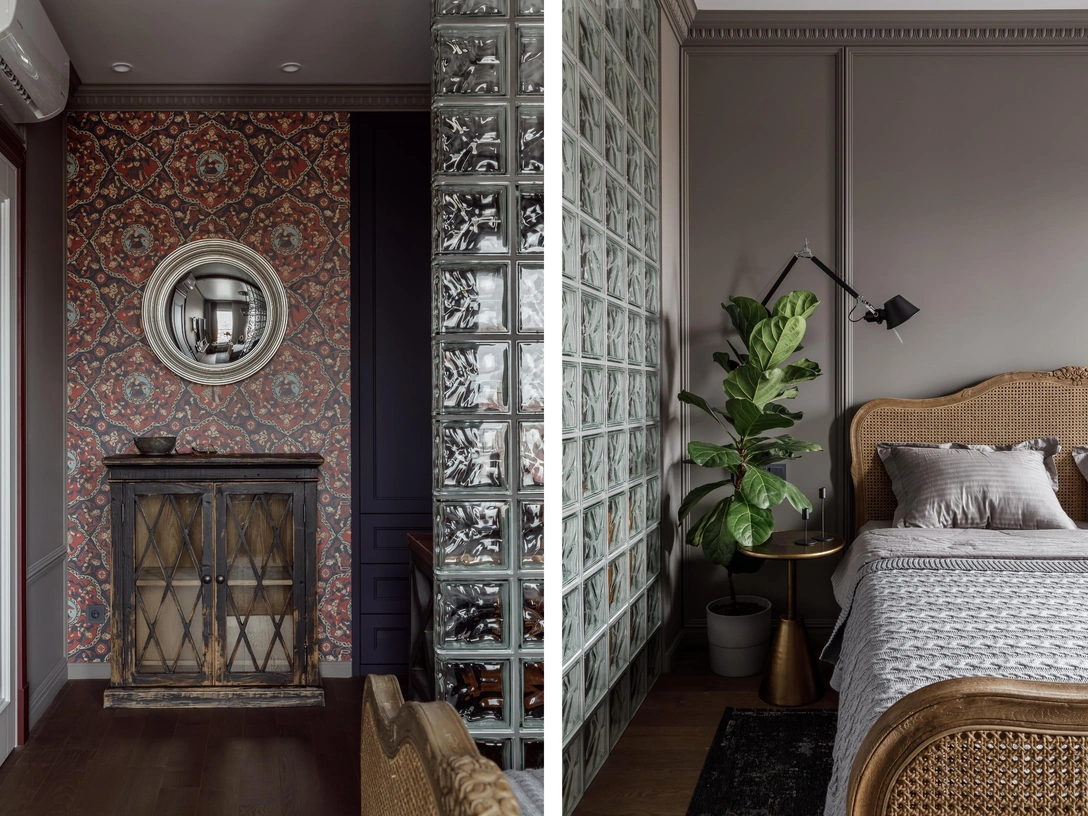 Спальня хозяина разделена на две зоны — кабинет и место для сна. Для зонирования использовали перегородку из стеклоблоков — так сюда поступает естественный свет. Мы разместили здесь библиотеку и большой шкаф для вещей.