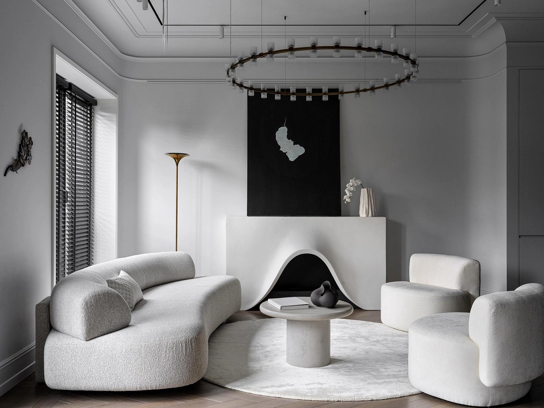 В интерьере в целом много скругленных стен и углов. На это нас вдохновила форма фасада — он немного закруглен, поэтому мы решили продолжить этот мотив. Мягкие линии повторяются не только на камине, но и в арочных формах, в пластике карниза, размывающего линию стыка стен и потолка. В центре квартиры мы разместили блок с гардеробной со скругленными углами — он выглядит акцентно и сам по себе удобен. К одной из его стен примыкает кухня, которую дополняет остров с хранением и эффектный кофе-пойнт.