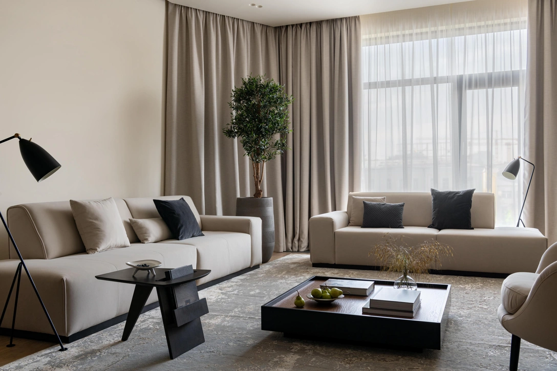 Кухню-гостиную оформили в светлых тонах, чтобы не отвлекать внимание от панорамы города за окном. Бежевую палитру разбавили черными деталями. Контрастные обеденные и барные стулья, открытый стеллаж для декора, торшеры с металлическими плафонами и скульптуры делают интерьер многослойным и динамичным.