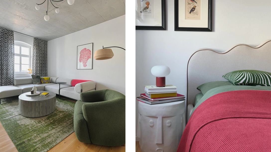Это арендованная квартира, так что планировку мы не меняли. Сначала пара хотела насыщенный и смелый интерьер, но потом они постепенно начали понимать, что в буйстве красок жить им будет не очень комфортно. Мы нашли золотую середину — хотелось, чтобы пространство все же выглядело индивидуально, поэтому мы решили сделать нейтральную базу и разнообразить ее нестандартными яркими элементами с активными принтами. Так у нас получилось сохранить характер и учесть запрос на лаконичность, создать интерьер без лишних нагромождений.