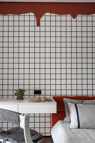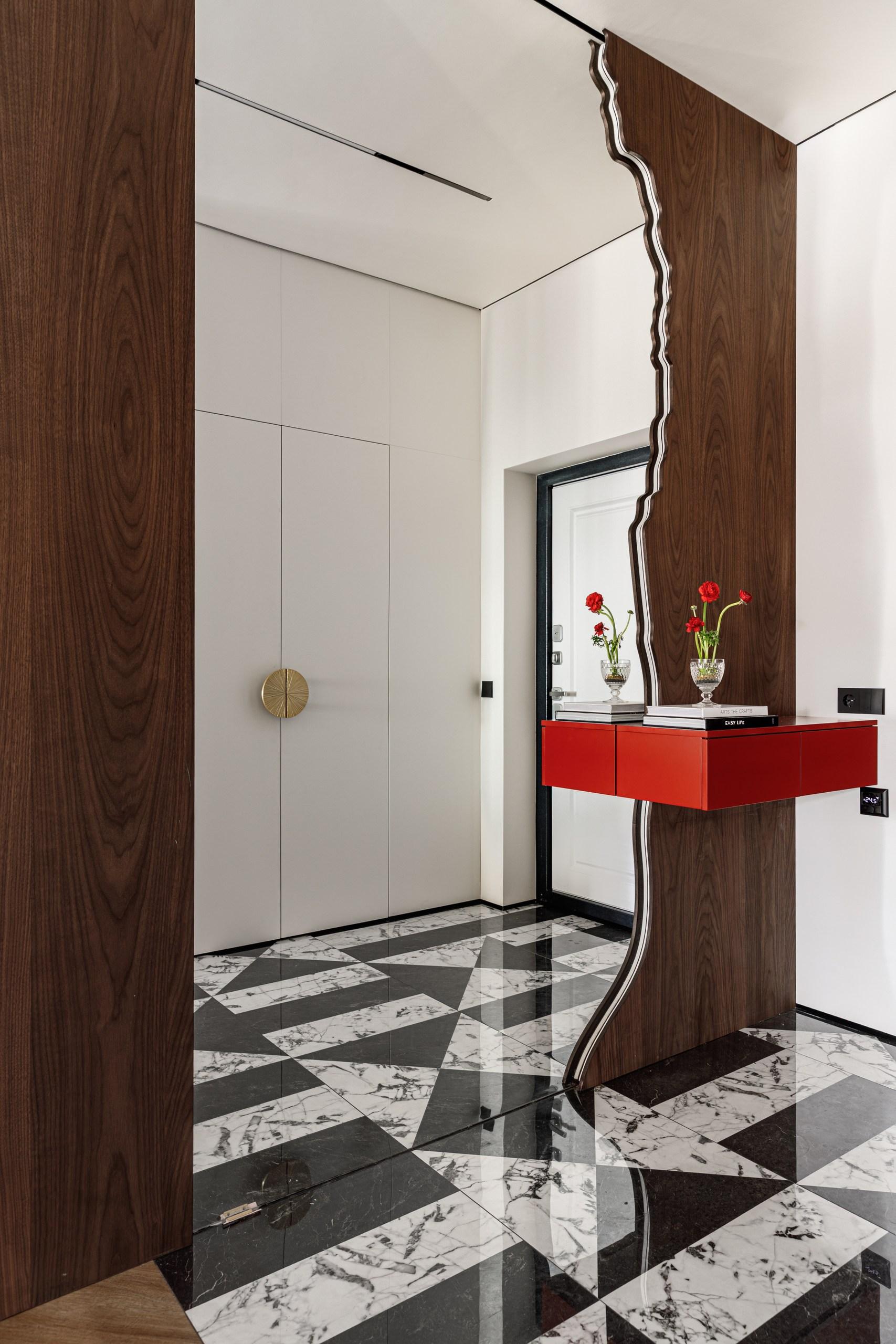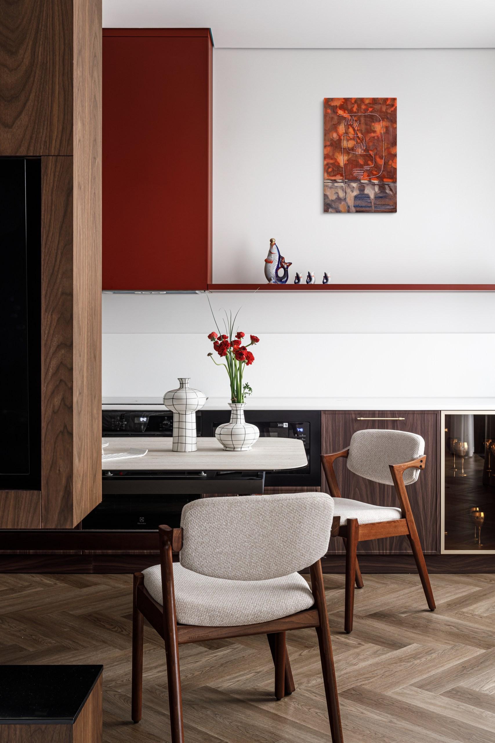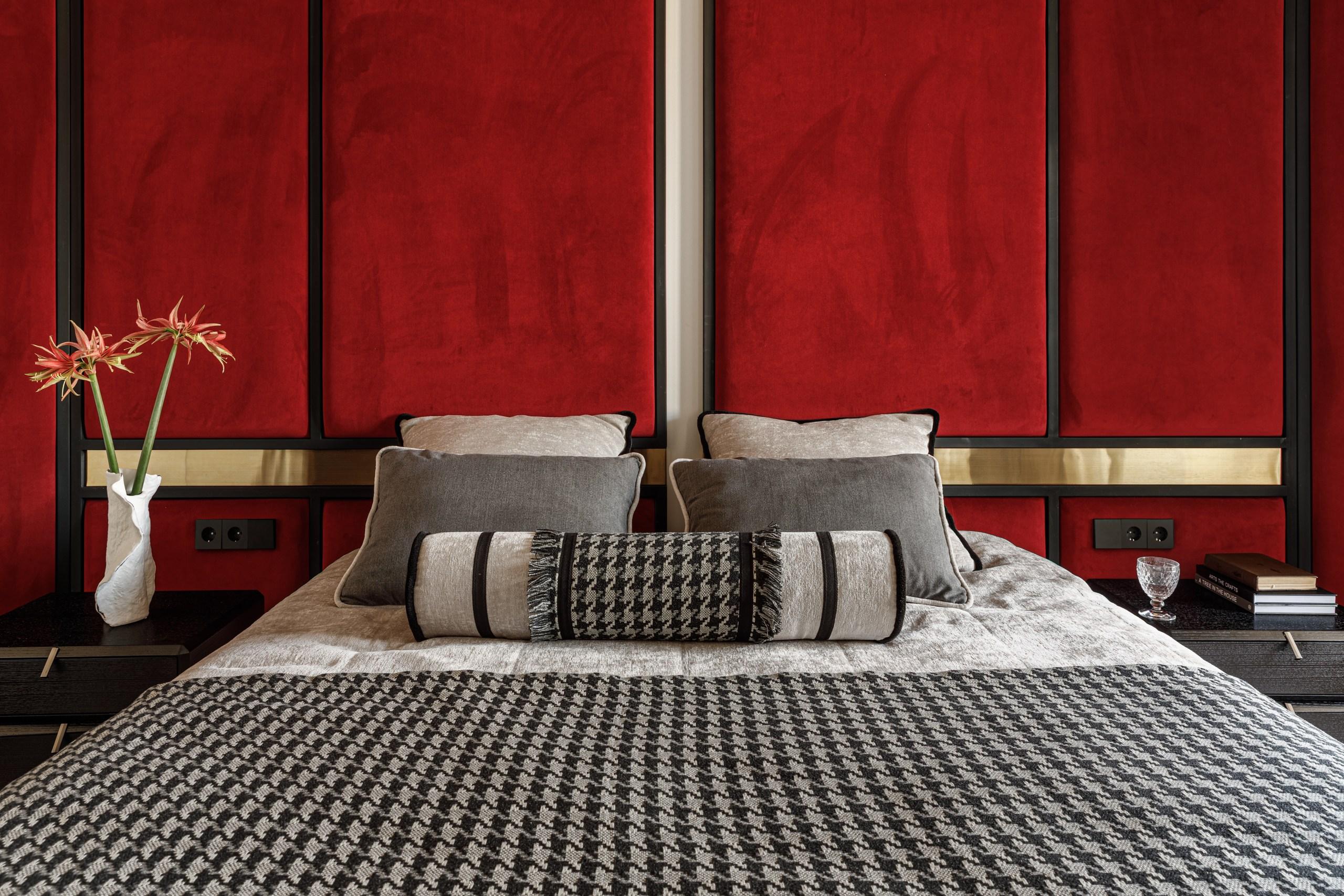 Больше всего красного цвета в спальне, в авторском бархатном изголовье — неожиданное на фоне общей спокойной гаммы решение. В сочетании с черными и латунными вставками выглядит элегантно, с ноткой восточного стиля.