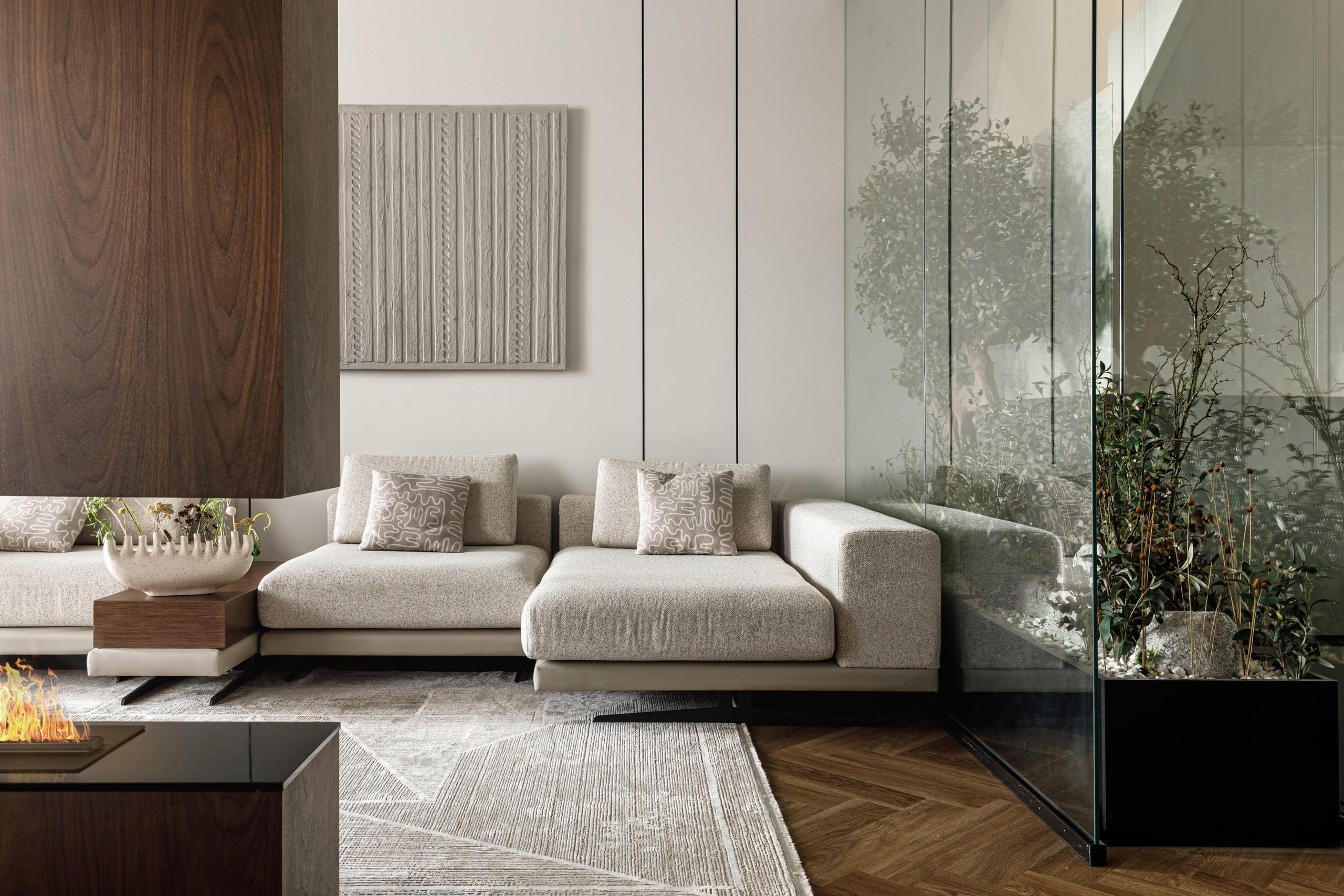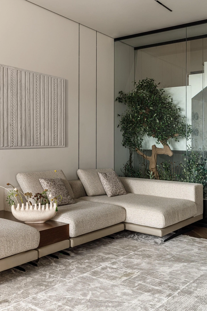А еще на первом этаже растет оливковое дерево — пластичная крона и выразительный ствол создают живую скульптурную композицию, которая меняется в зависимости от освещения и ракурса. Для этого мы демонтировали глухую стену из газоблока — так пространство выглядит гораздо воздушнее. Флорариум прекрасно вписался в лаконичный дизайн гостиной, став главным акцентом.