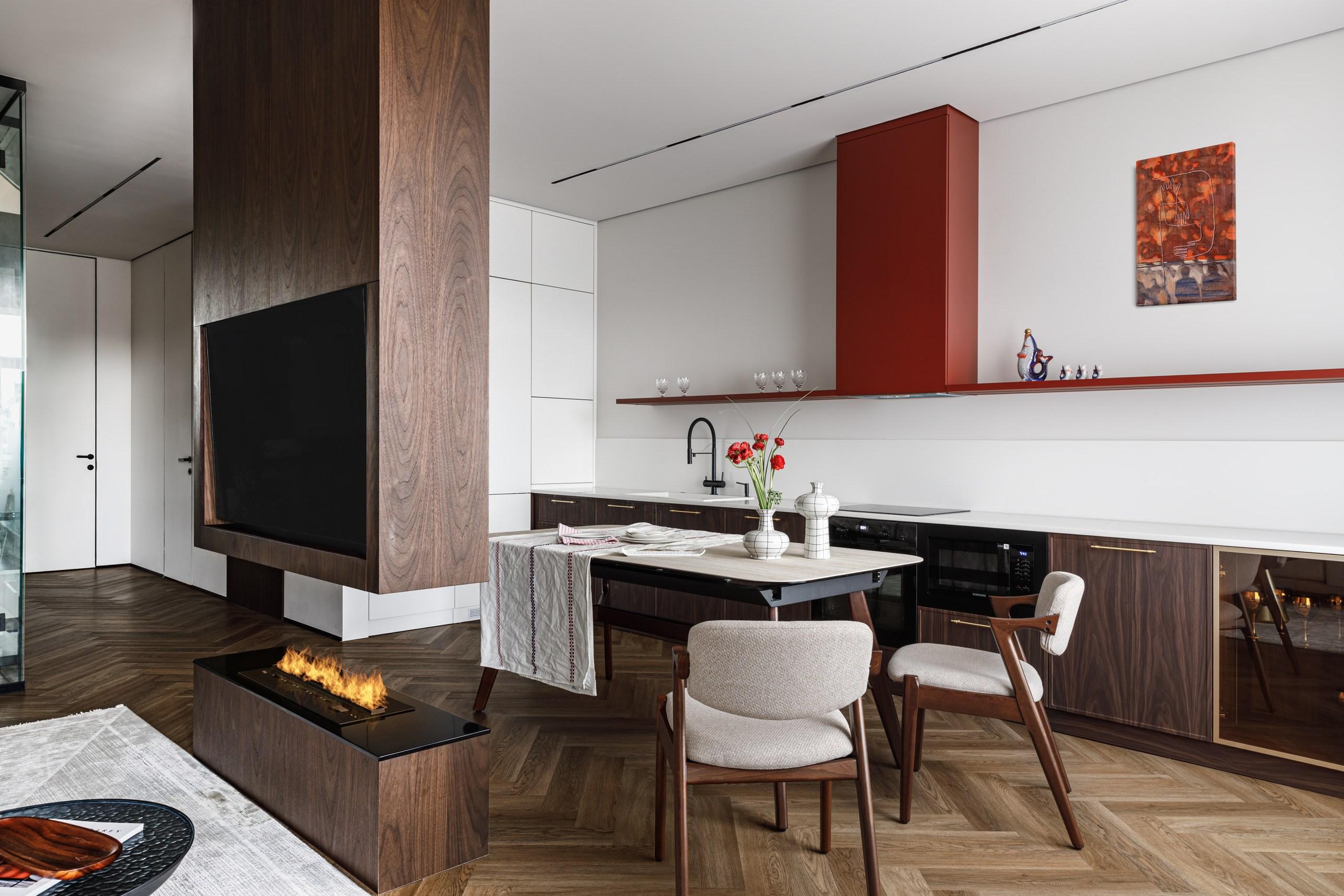 Кухонную вытяжку скрыли за аккуратными панелями из МДФ — глубокий красный цвет делает ее эффектным акцентом. По обе стороны — «вырастающая» из нее линия полки. Благодаря этому вытяжка не выбивается из общей композиции, и даже становится ее украшением.