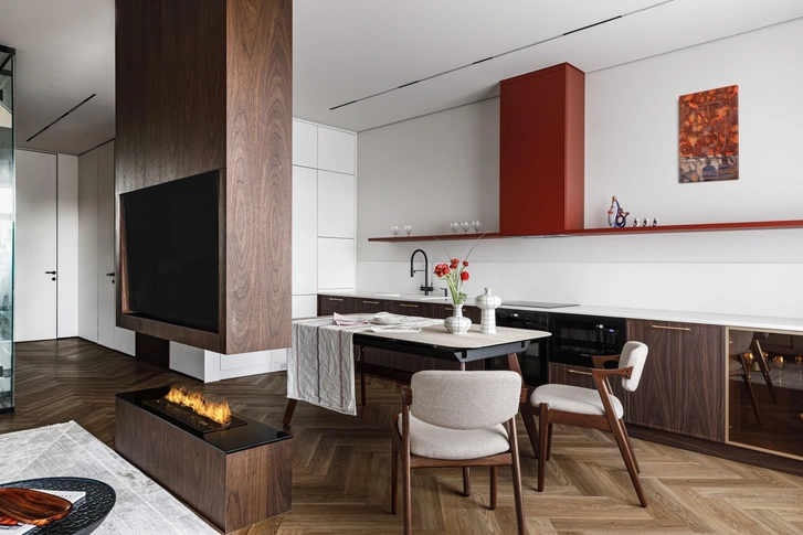 Первоначальная планировка от застройщика предполагала традиционную большую гостиную и отдельную кухню, но команда Аи Елюбаевой предложила более эффективное решение — объединить кухню и гостиную в одно общее пространство. Заказчики мечтали, чтобы в доме ощущалась воздушность, и свободная планировка его как раз дает. Зонирование здесь очень мягкое, аккуратное: кухню и гостиную разделяет парящий шпонированный блок, куда вмонтирован камин.