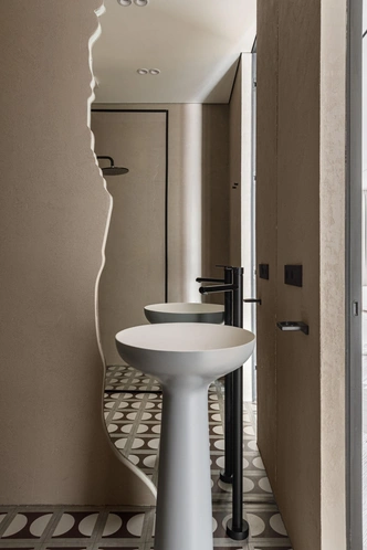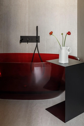 В санузлах тоже есть смелые решения. Интерьер гостевой ванной комнаты уютный и тактильно приятный, стены здесь отделаны микроцементом. А в мастер-санузле — темно-вишневая прозрачная ванная, в рифму алому изголовью в спальне.