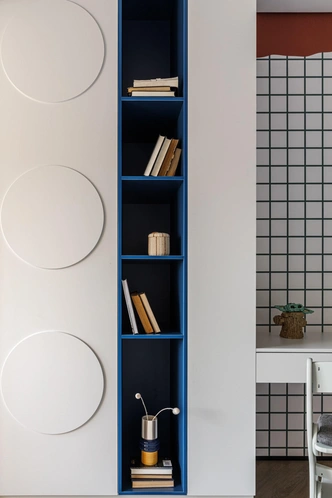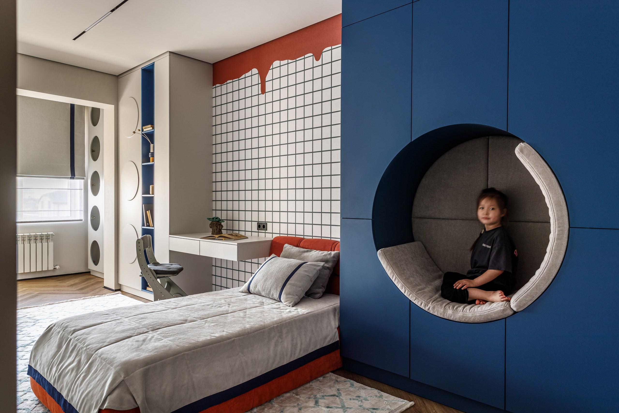 Детская получилась интересной и динамичной. Главная деталь — шкаф с круглой нишей, внутри которой организована мягкая зона для чтения. Он делает интерьер живым и индивидуальным, здесь действительно хочется уединиться и почитать книгу.