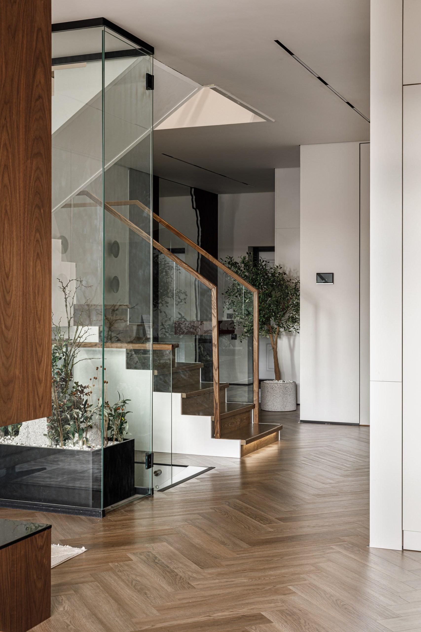 За ней стоит лестница со стеклянными ограждениями, она будто парит, поддерживая атмосферу легкости и спокойствия. К тому же, благодаря стеклу в прихожую проникает мягкий дневной свет. В прихожей тоже есть на что посмотреть — приятная игра линий и фактур, плавная форма зеркала, контрастный керамогранит.