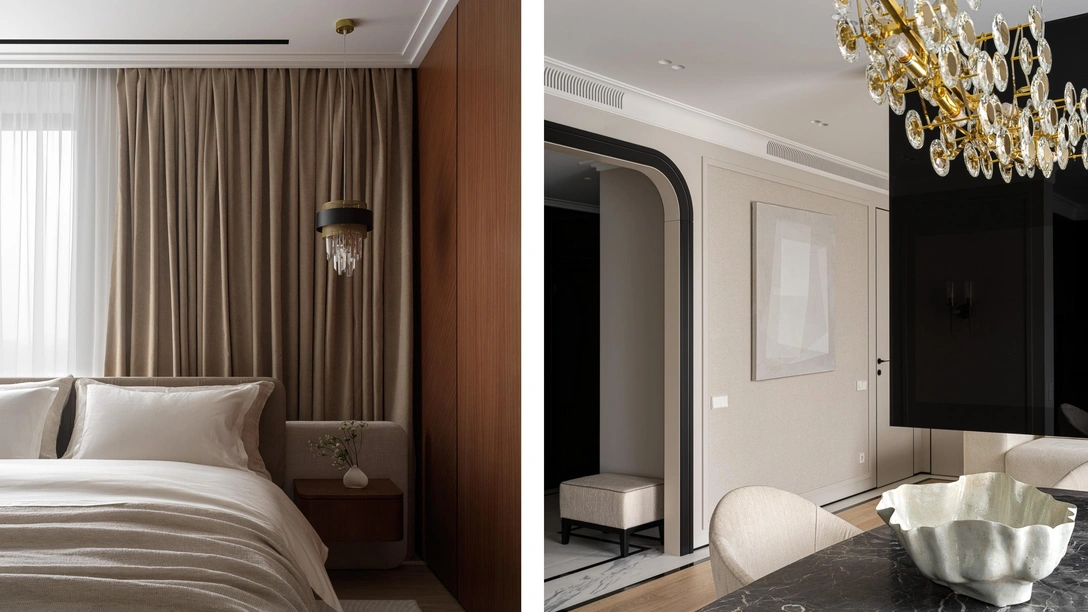 Заказчики пришли к нам со своими референсами, на которых им нравились лишь отдельные детали — мы помогли им сформировать единую стилистику, которая могла бы угодить обоим. А это было не так просто: муж хотел сдержанный минимализм, а жена — что-то более торжественное и классическое. Мы подумали, что лаконичный современный интерьер с элементами классики и ар-деко — это то, что нужно.