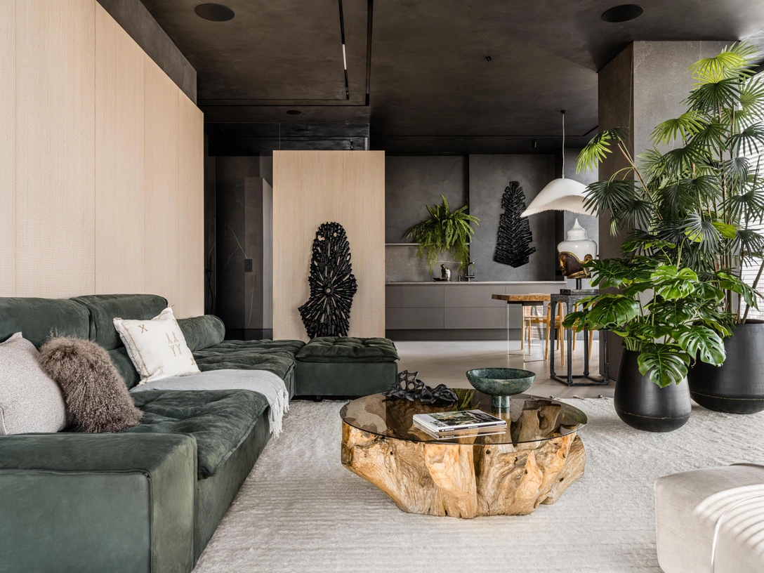 Этот проект создавался для молодого человека. Здесь использовано много натуральных материалов, тропических растений, природных текстур и необычного акцентного декора: заказчик хотел создать современный интерьер с элементами балийского стиля.