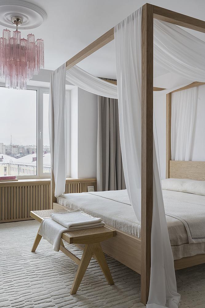 На одной оси со стеллажом находятся высокие распашные двери — на ней же мы расположили винтажную люстру. Легкости спальни придает не только мягкий оттенок, но и воздушный балдахин. Расслабленности и спокойствия вносит и светлый оттенок дерева. Игра текстур делает пространство живым.