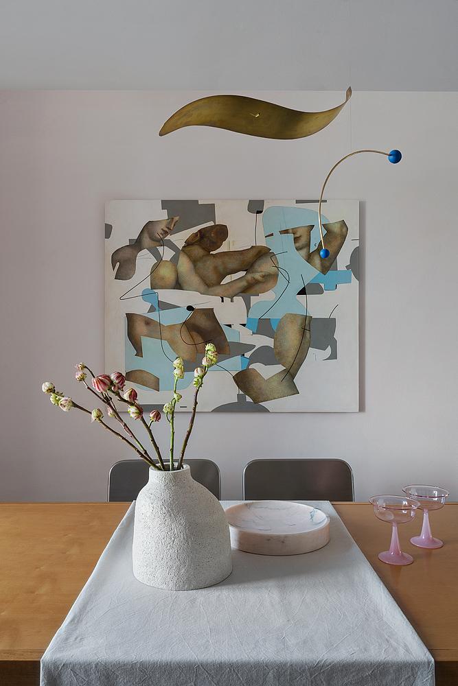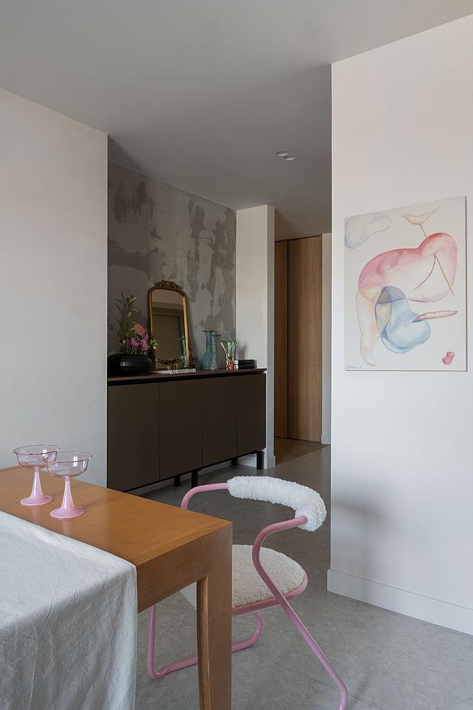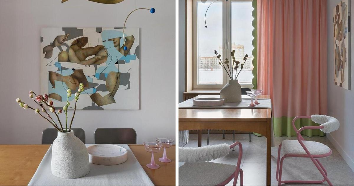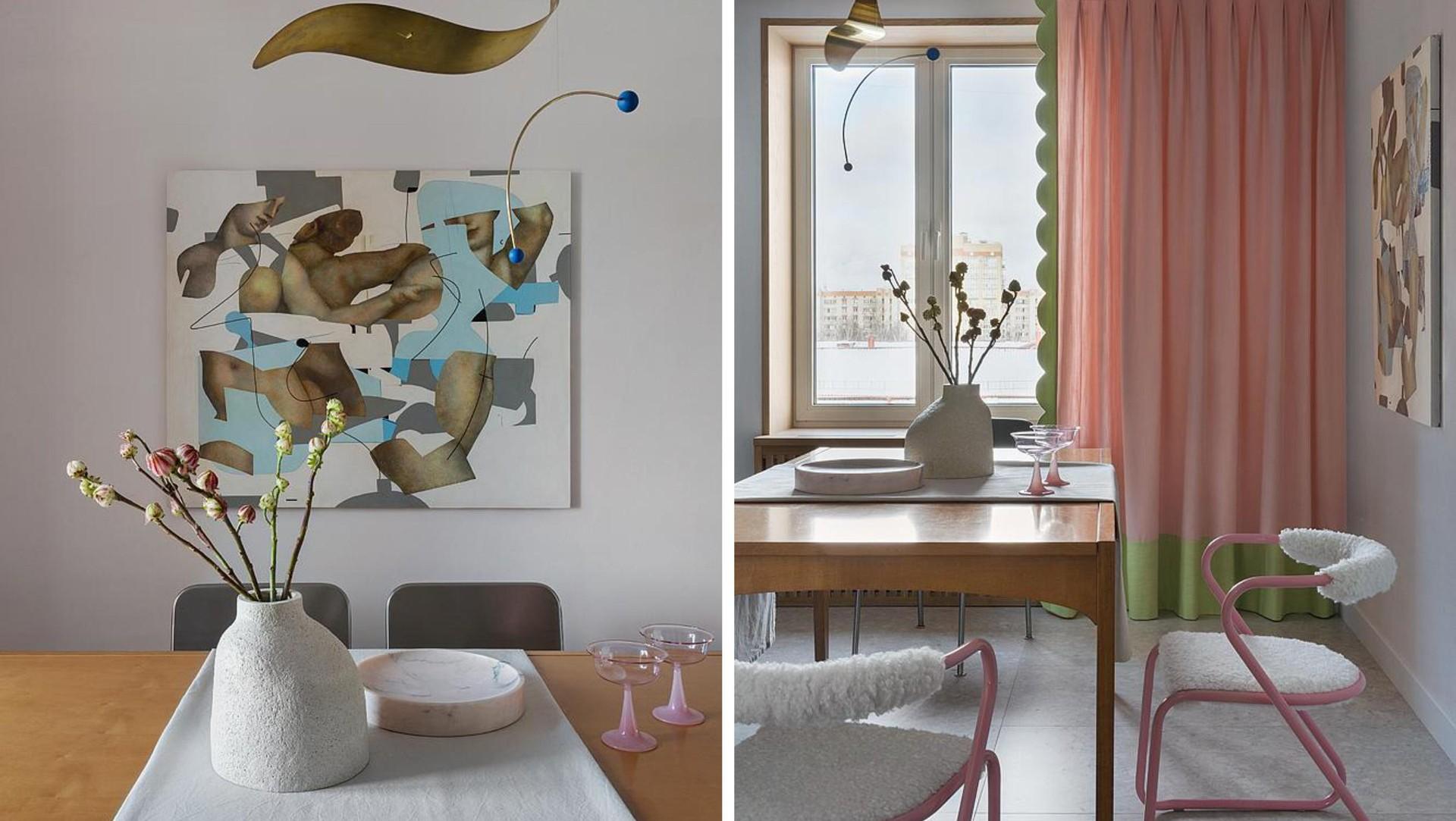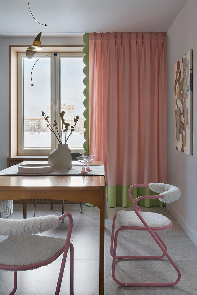 Много розового на кухне: стулья с металлическим розовым каркасом и обивкой, напоминающей облачко; необычные нежно-розовые шторы с зеленым акцентом. Все это дополняют произведения искусства. Я рада, что удалось угодить всем членам семьи и объединить разные желания каждого в единую концепцию.