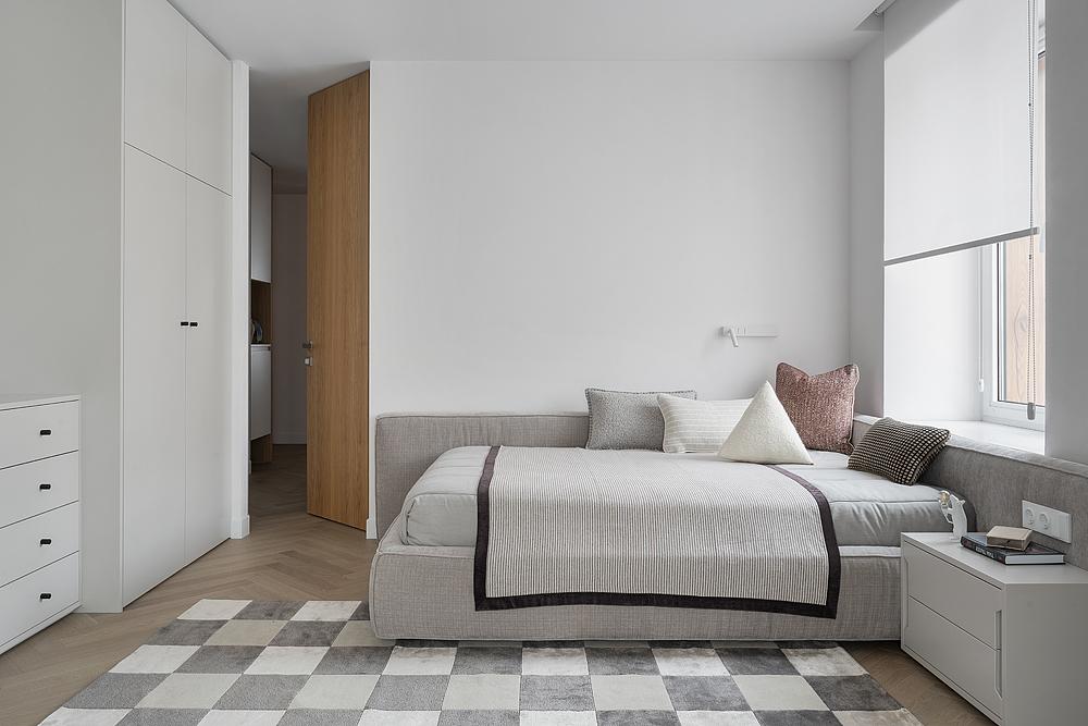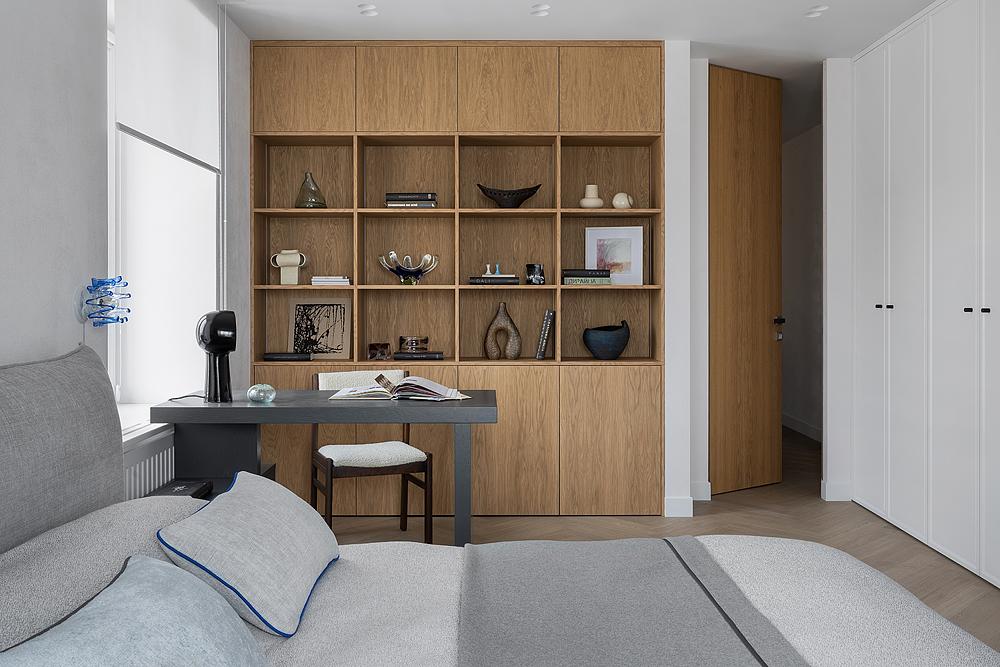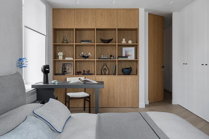 Именно ее смелость позволила создать интерьер, где каждая деталь имеет значение. Так появился открытый стеллаж розового оттенка туфель Prada, изысканные бра из муранского стекла и эффектные распашные двери из шпона в спальне.