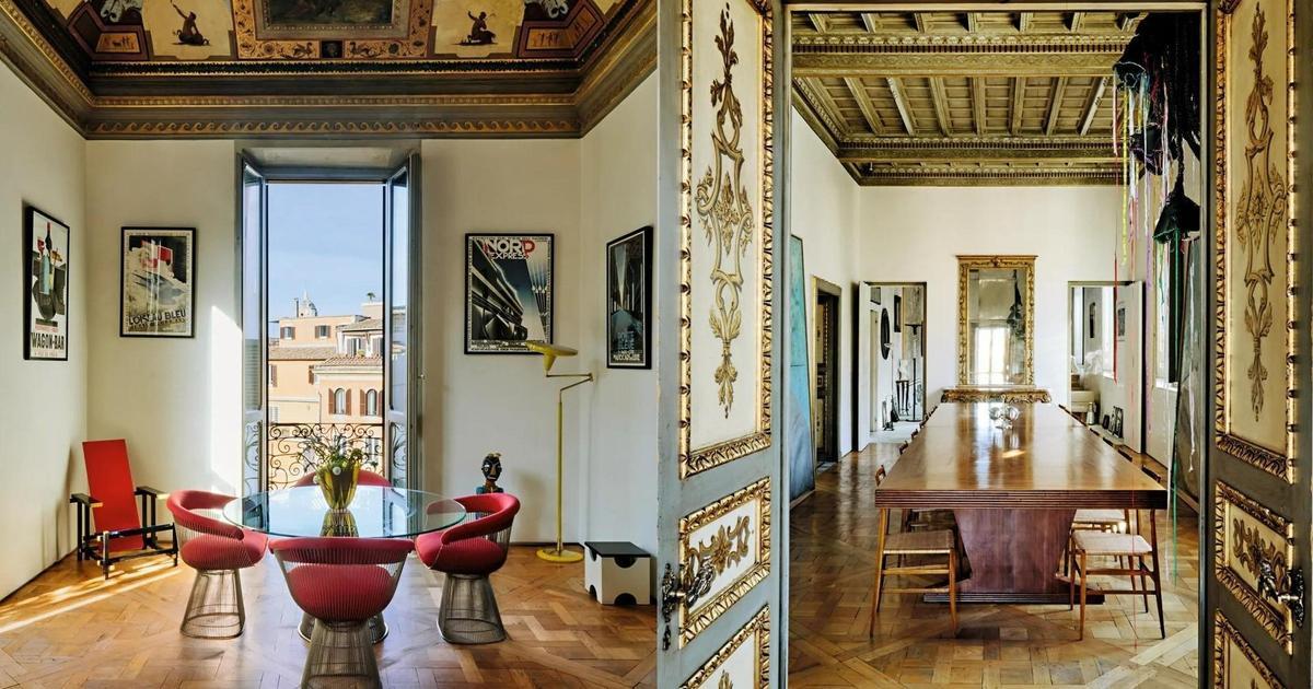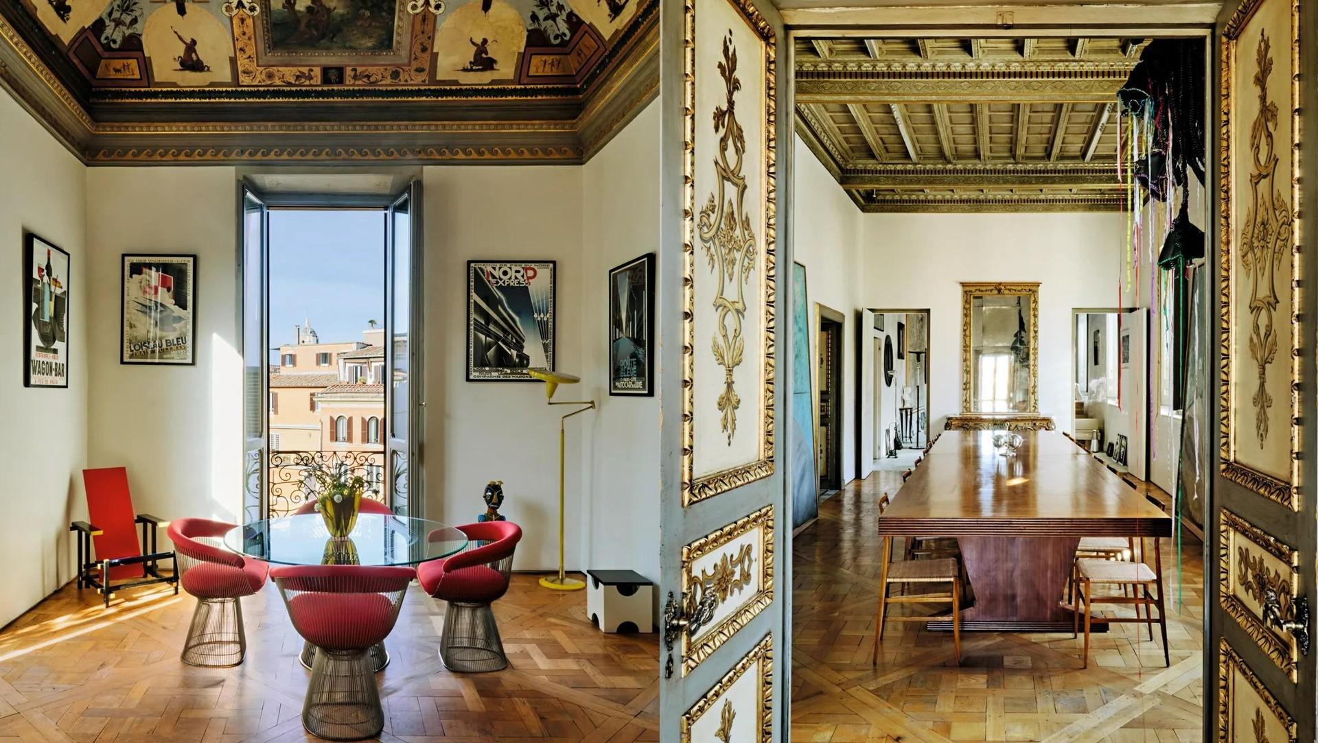 Вокруг — стулья середины века, легкие и почти невесомые. Двери в столовую — отдельный предмет гордости: они инкрустированы деревом, а ручки сделаны в форме буквы B (в честь семьи Боргезе). Эти детали, по словам Тухами, датируются XIX веком.