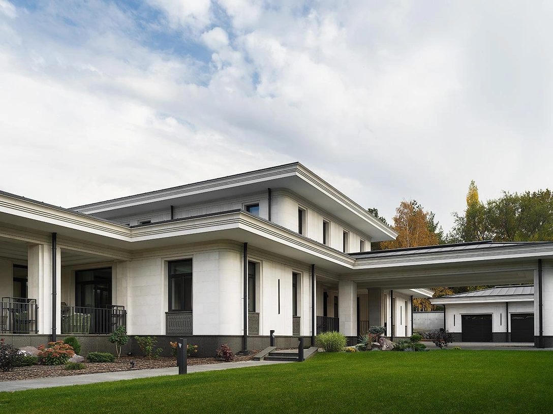 Особое внимание уделено фасаду дома, где сложные геометрические рисунки выполнены из натурального камня — его доставляли из Черногории и Италии. Мы позаботились о том, чтобы внешний облик дома не был перегружен и все элементы были функциональны.