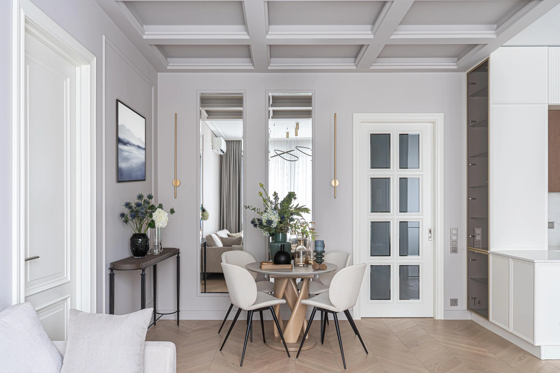 Поэтому цветовую гамму мы выбрали нейтральную, но не монотонную. Здесь можно встретить оттенки синего, изумрудно-зеленого и теплые древесные тона. В центре планировки — зона кухни-гостиной, она очень просторная, наполненная светом и воздухом. Потолочные кессоны, разрезающие плоскость потолка, визуально увеличивают объем квартиры, делают ее интереснее. А зеркала на стенах прихожей, гостиной и спальни создают иллюзию расширения пространства. Дополняют интерьер картины на стене от Екатерины Лямуан («Пиньи с фиолетовым небом») и Виктории Иконен (Foggy morning).