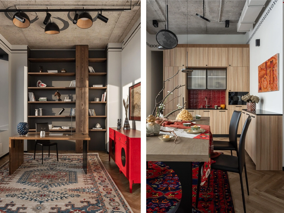 Горжусь тем, что интерьер получился абсолютно не тяжелым, не пафосным, а очень легким и воздушным. Удалось подчеркнуть этническую принадлежность без слишком поверхностных и заезженных элементов. Рабочие зоны максимально современные и функциональные, а общие зоны — более декорированные, с акцентами.