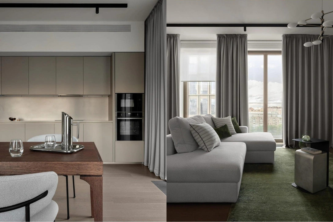 В гостиной — это панорамные окна, наполняющие пространство светом и открывающие захватывающий вид на Москва-Сити. В кухне главенствуют функциональность и эргономичность, гарнитур утоплен в нишу, лаконичные фасады кофейного оттенка выделяются на фоне белых стен, но не перегружают интерьер. При разработке колористического решения авторы проекта придерживались правила 60-30-10: 60% пространства занимает основной цвет, 30% — дополнительный, 10% — акцентный.