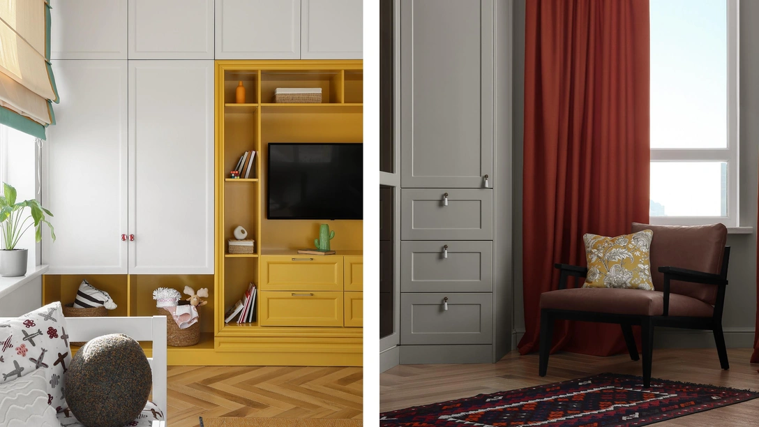 Детские оформлены красочно, но без кричащих цветов. Мы видим сочетание небесно-голубого с персиково-розовым, горчично-желтого с белым.