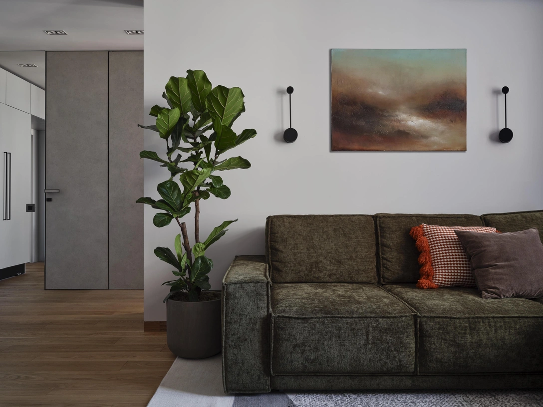 Одним из самых интересных элементов интерьера стала ТВ-тумба со встроенной акустикой. Это решение позволило добиться качественного звука, сохранив при этом лаконичный облик гостиной. Еще одной необычной деталью стал встроенный мини-бар, спрятанный под столешницей — он гармонично вписался в пространство и остался практически незаметным.