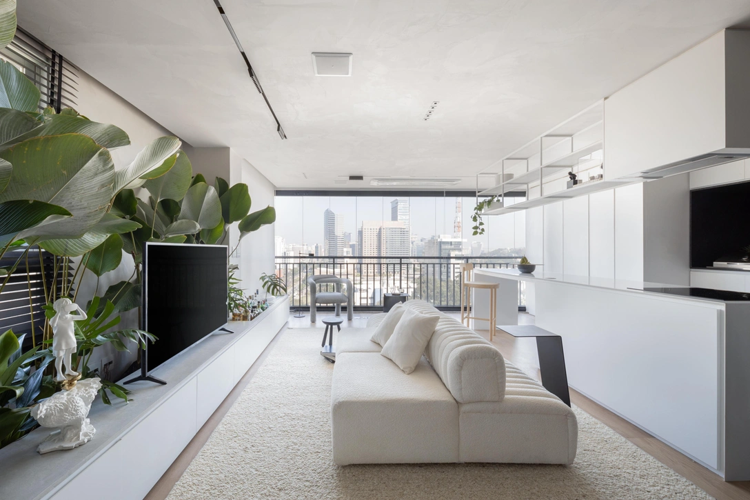 Гостиная, кухня и большой балкон, откуда открывается вид на мост Октавио Фриас де Оливейра, формируют единое пространство. Динамичный пейзаж контрастирует с лаконичностью отделки — стены и потолки в квартире покрыты белой штукатуркой с приятной бархатистой текстурой, а на полу лежит деревянная доска. На получившемся светлом фоне выделяются панели из темного дерева, закрывающиеся спальню, и черный гранит сорта São Gabriel на фартуке кухни.