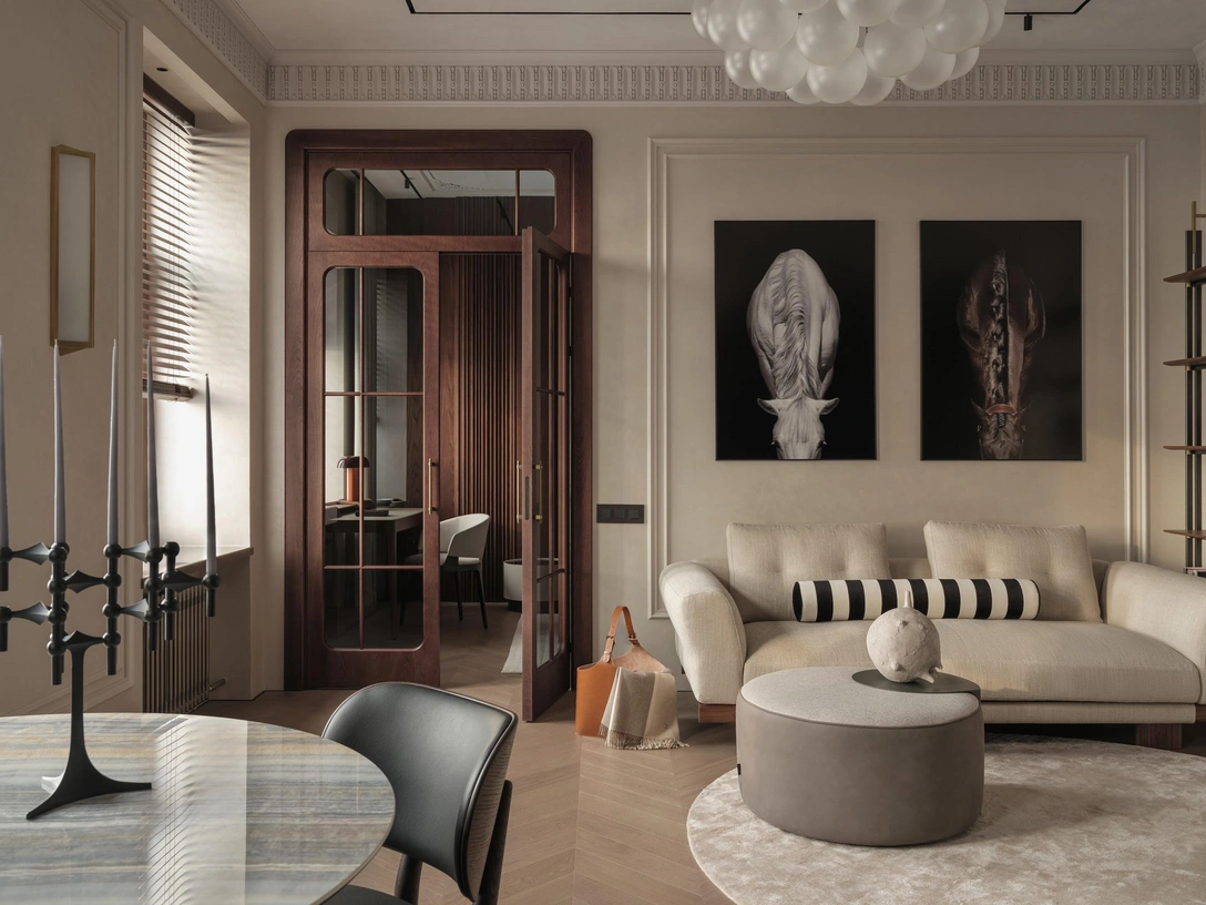 Квартира задумывалась как личный пятизвездочный отель, здесь хозяева и их близкие останавливаются во время командировок и отпусков. Вдохновившись архитектурой самого дома и впечатляющей панорамой города, за основу взяли черты современной классики. Паркет французской «елочкой», лепные украшения и штукатурка с легким эффектом состаренных стен поддерживают дух и стиль бывшего доходного дома.